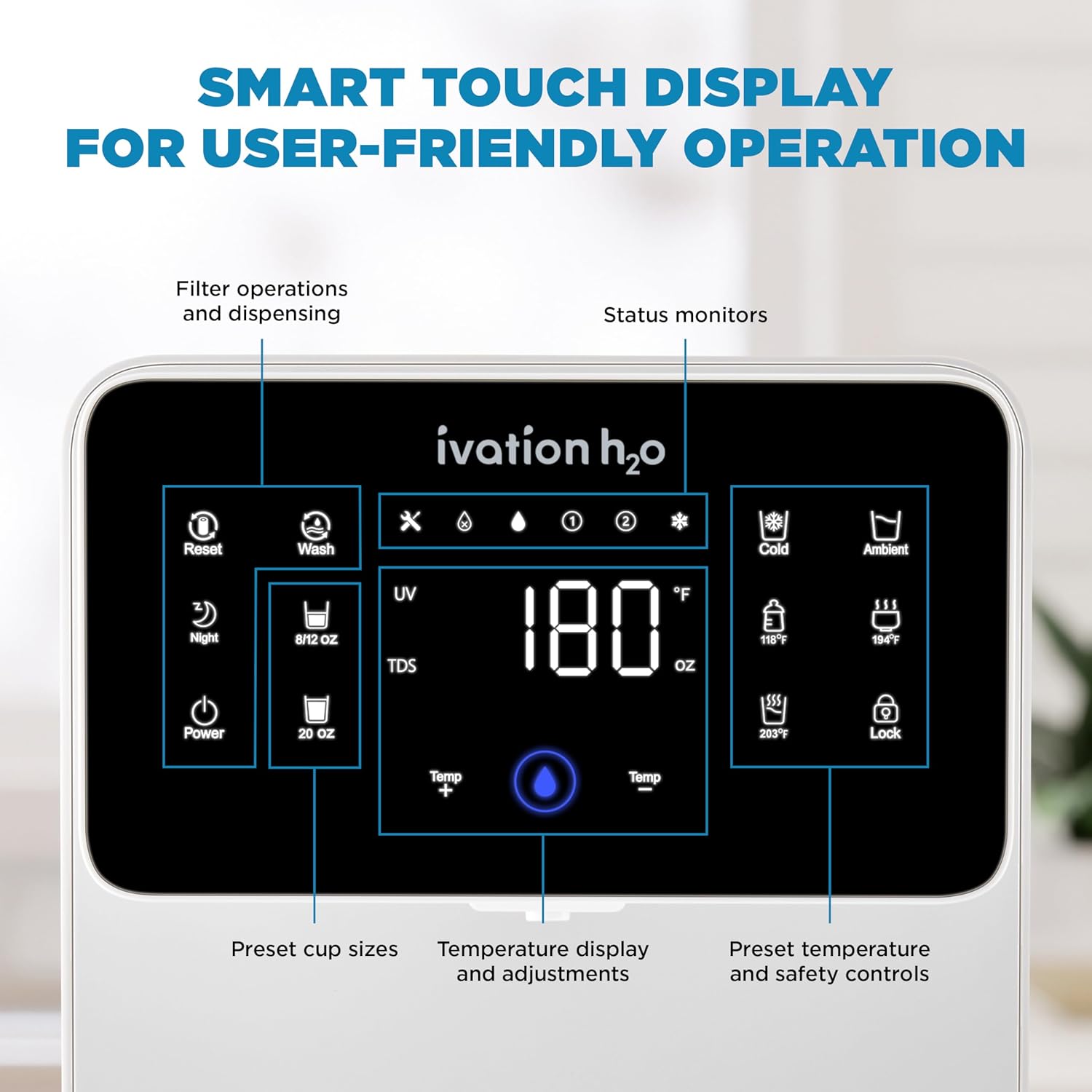 - INTUITIVE DIGITAL INTERFACE: Customize your hydration experience with the elegant backlit touch screen offering 6 temperature presets and 3 volume options. Perfect for anyone wanting a hot and cold reverse osmosis water system or a reverse osmosis water cooler in a stylish design.