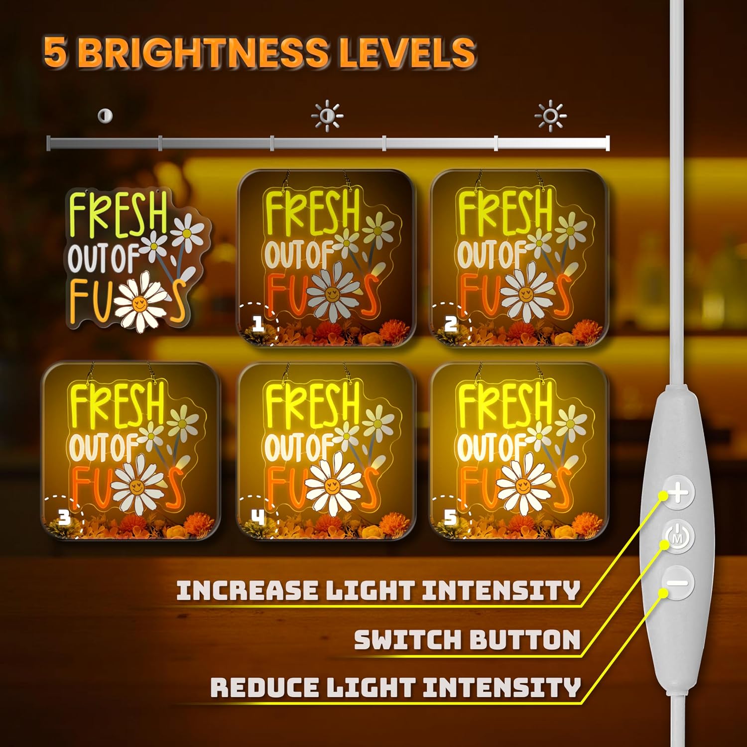 - 【Premium Material】 "FRESH OUT OF FUS" neon light back is made of sturdy and highly transparent acrylic backboard and anti-fall PVC material, the surface adopts the latest LED neon flex technology, the light is soft and uniform, low energy consumption, no risk of overheating or glass damage, long life, safer and brighter than traditional glass neon lights. Handmade to ensure a strong bond.