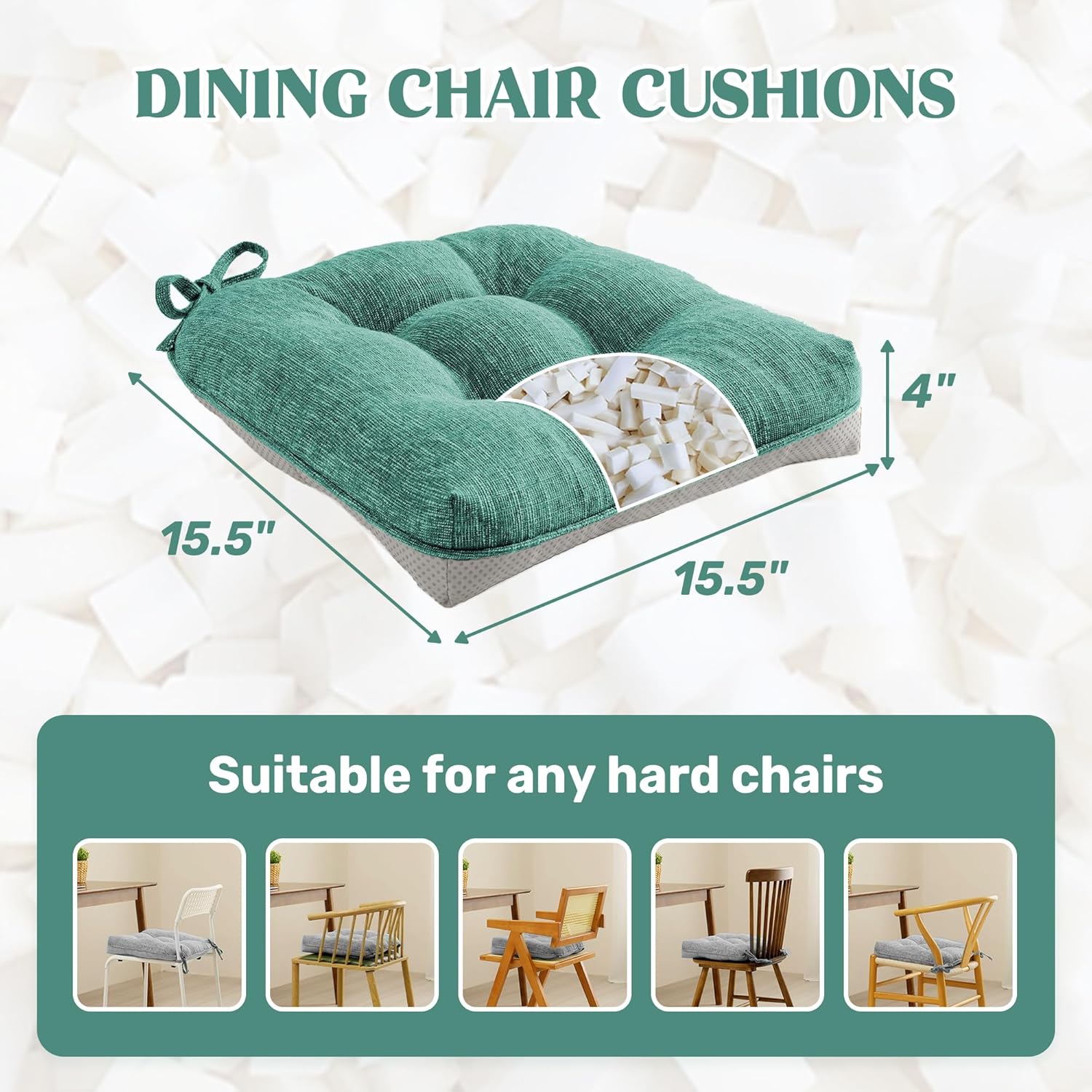 puredown® Chair Cushions for Dining Chairs, Tufted Memory Foam Chair Pads with Non-Slip Backing, Kitchen Seat Cushions with Ties, Washable Seat Pad Set of 4, 15.5" x 15.5" x 4", Green
