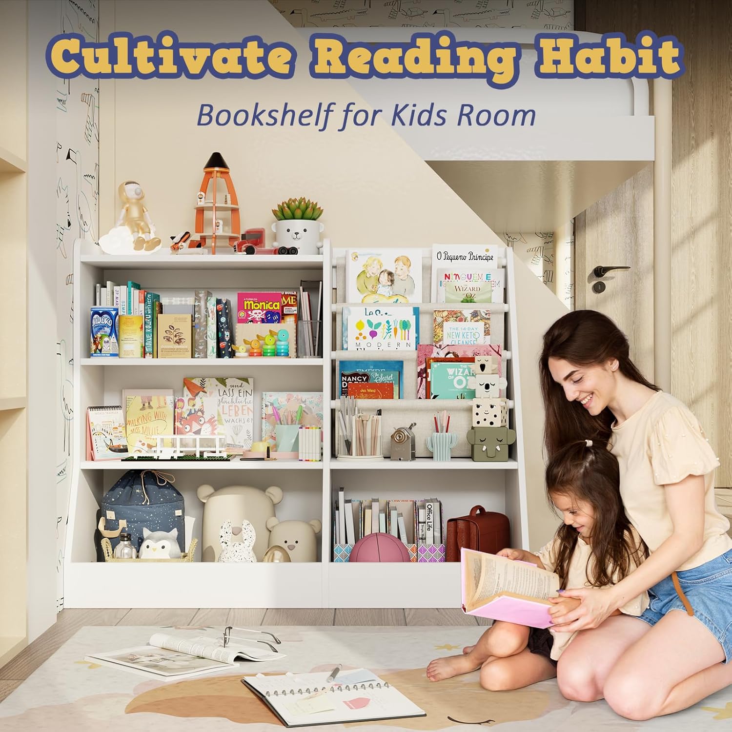 - Large Storage Space --- 4 Tier wooden structure is not only a bookshelf where can store children's books, colouring books, comic books and other book supplies, but also a great toy organizer for blocks, dolls and plush toys; deep cotton linen storage pockets on the right side for better display of front facing books, easy for child to identify and reach.
