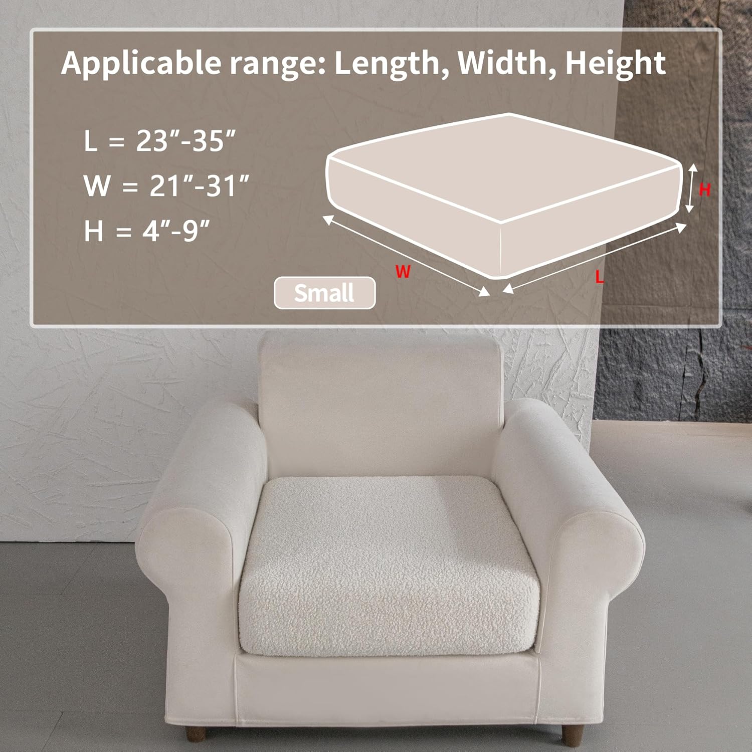 - 1.WHAT YOU WILL GET: 1*Seat Cushion Cover S. Suitable for sofa cushions with Length: 23-35 inches, Width: 21-31 inches, Height: 4-9 inches.This sectional couch cover is tailor-made for your sofa and can effectively resist stains, dust, pet hair and daily wear and tear.Made of soft Polar Fleece fabric, it adds a cozy and warm touch to your seat.