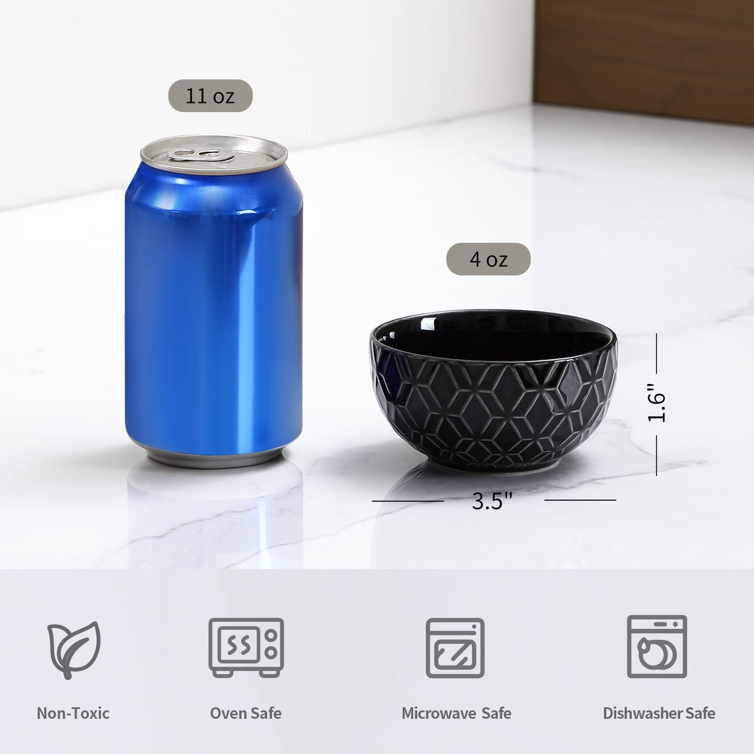 Sureasy Small Bowls 4 OZ, 3.5 Inch Dipping Bowls, Ceramic Embossed Mini Bowl for Side Dishes, Sauces, Appetizer, Housewarming, Set of 4, Black