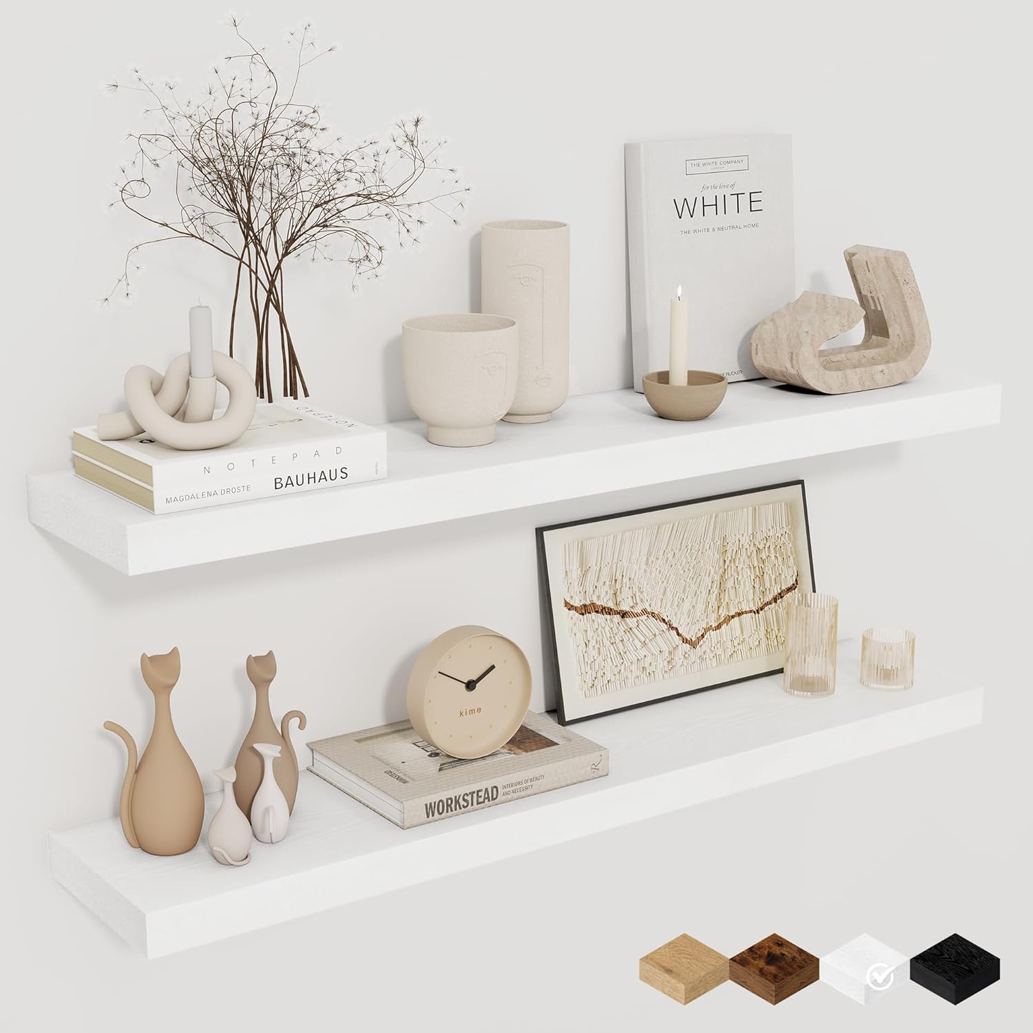 Fun Memories 32Inch Floating Shelves for Wall 2 Pack Wood Shelves for Kitchen, Bathroom, Bedroom Wall Mounted Rustic Wood Floating Shelf with Invisible Brackets for Books, Storage, Decor, White