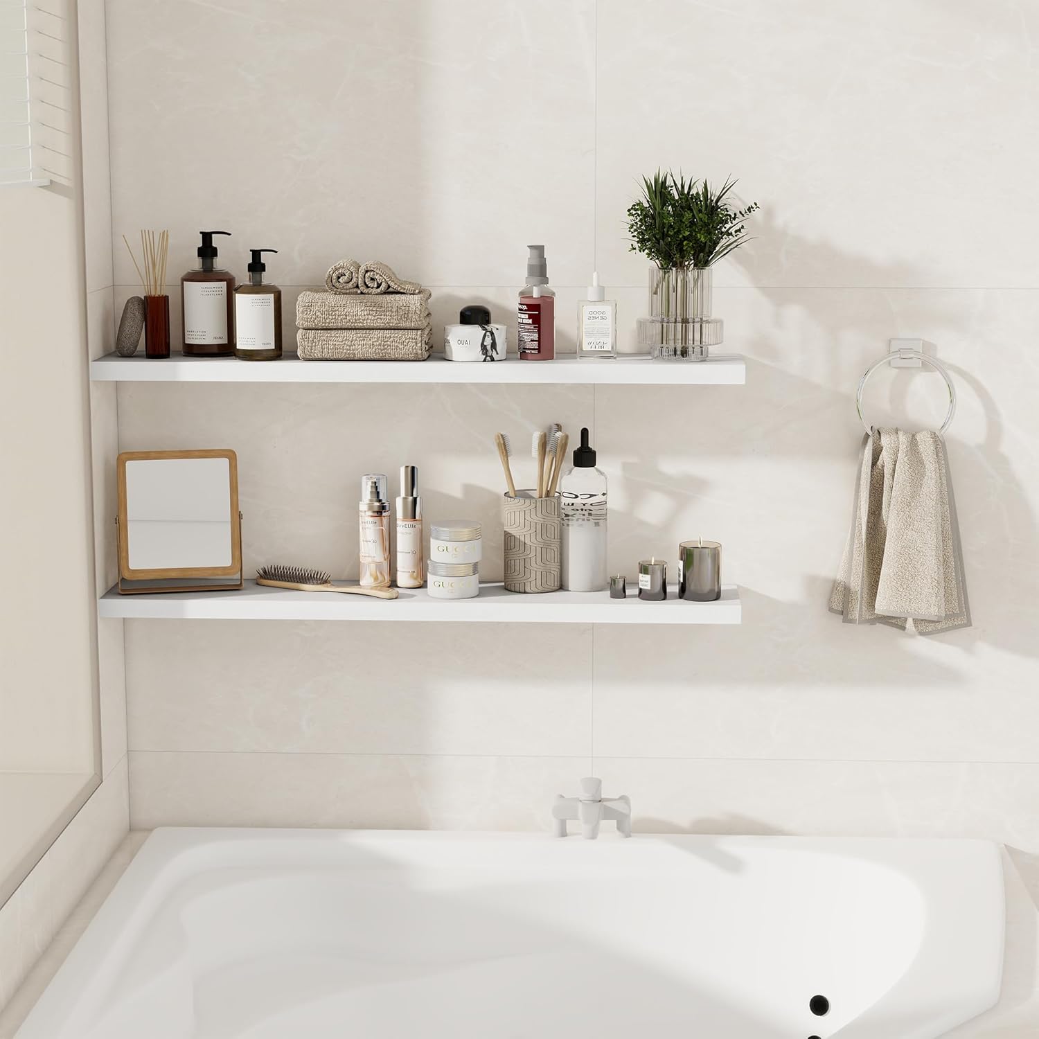 - STYLE & VERSATILITY: Elevate your home with our set of 2 elegant wall shelves, designed for versatile display options. Arrange them side by side for a clean, unified look, or stagger them for a bold, dynamic effect. Adding a touch of sophistication while providing practical storage