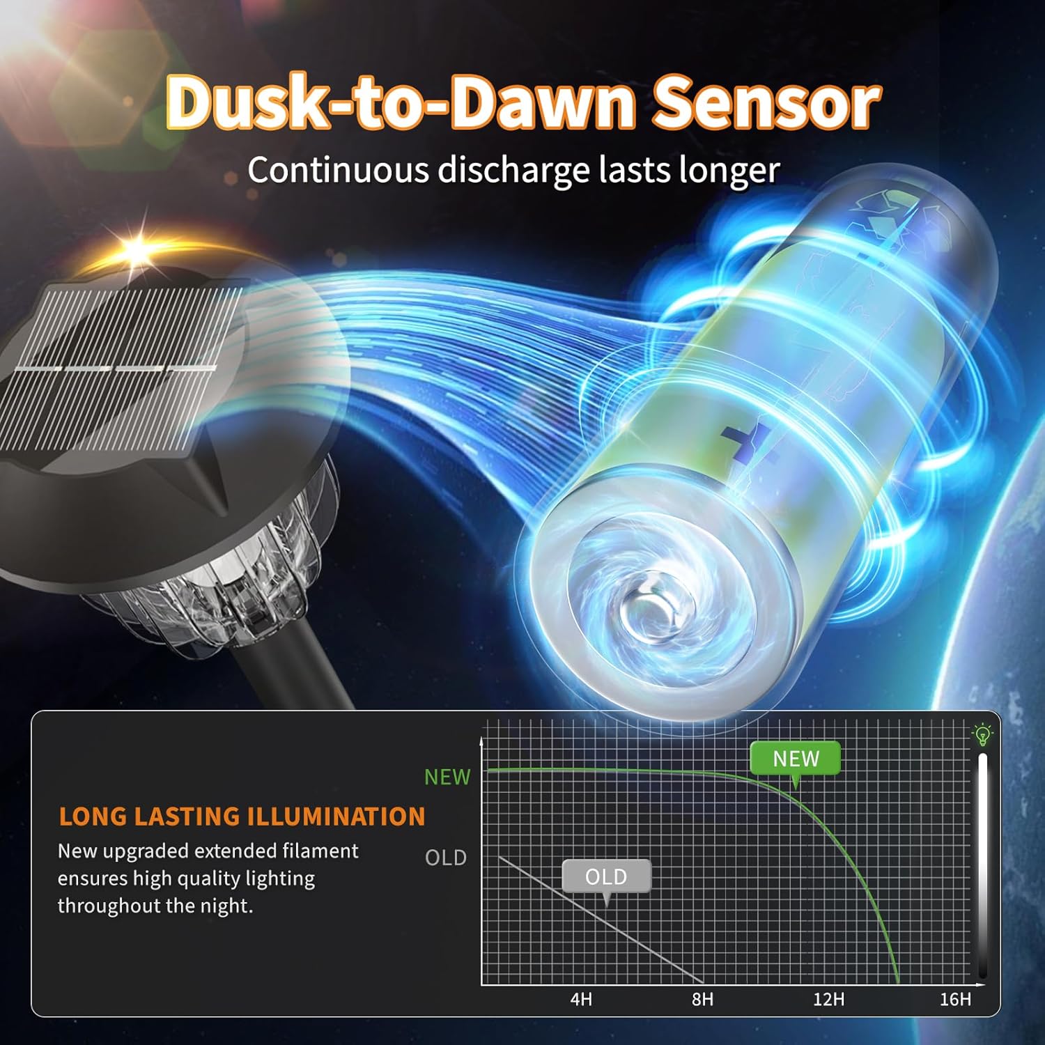 - DUSK TO DAWN LIGHT UP OUTDOOR LIGHTS: Solar powered lights automatically turn on at night and turn off at dawn which enables led pathway light conserves battery life for when it’s needed most. The solay walkway lights provide a good amount of illumination after a sunny day.