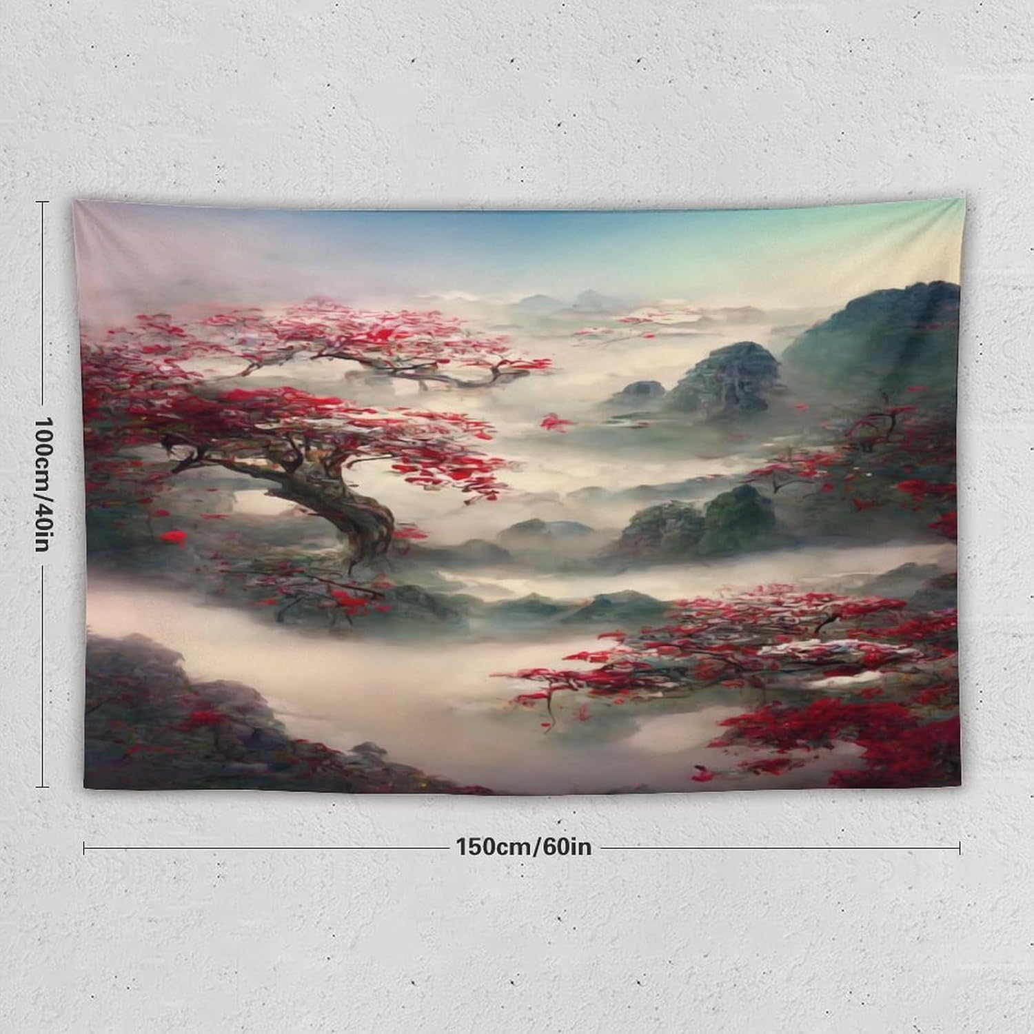 Japanese Tapestry, Red Plum Cherry Blossom Mountain, Asian Wall Art, Nature Landscape for Bedroom & Living Room Decor, 60"x40"