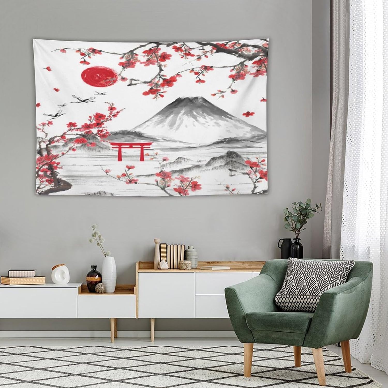 Red Cherry Blossoms Tapestry, Japanese Fuji Mountain Tapestry, Asian Japanese Wall Tapestry, Nature Landscape Tapestries for Bedroom Living Room Decor 90"x60"