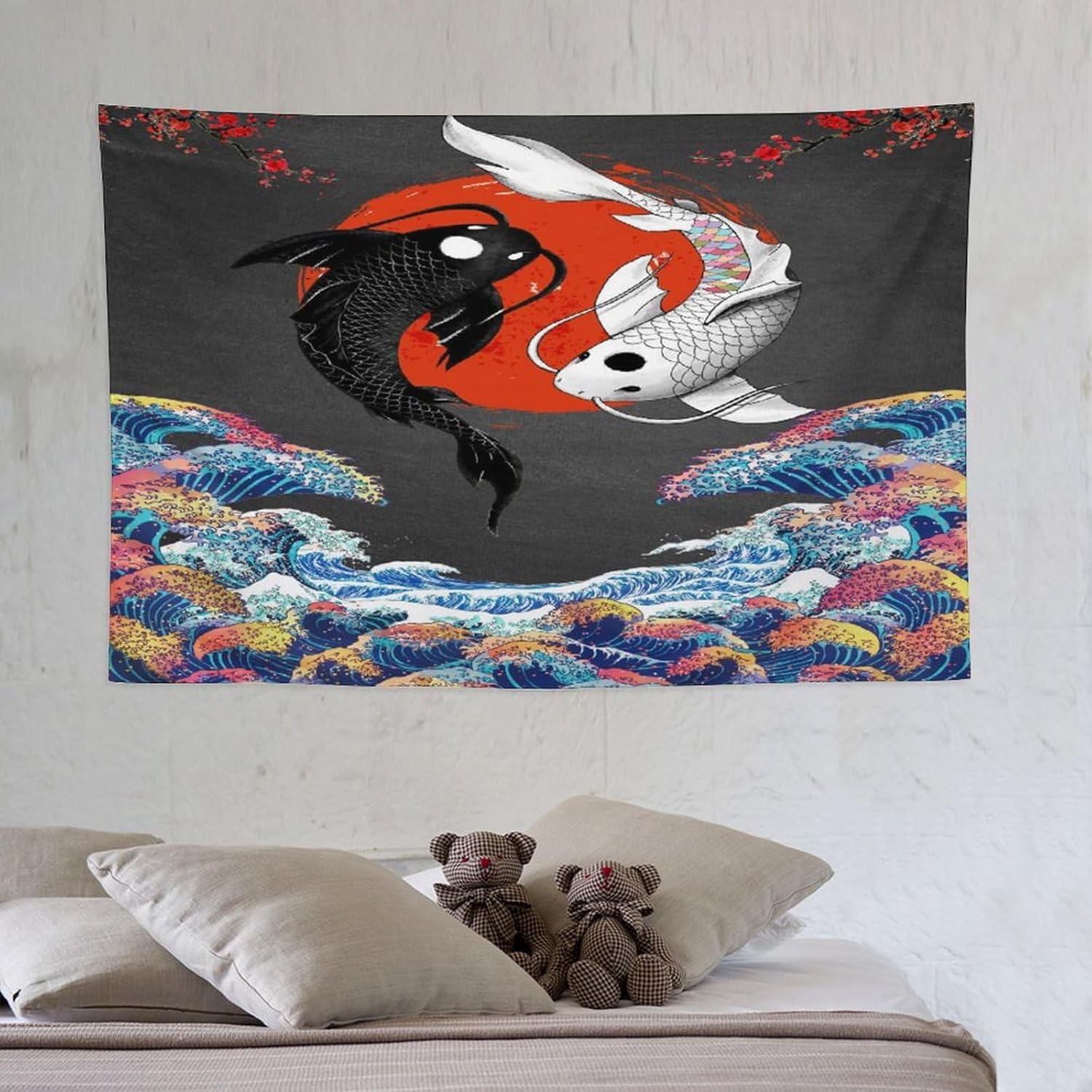 Houselerax Japanese Koi Fish Tapestries, Yin Yang Big Wave Cherry Blossom Tapestry Wall Hanging for Bedroom Living Room Office Decor 60"x40"