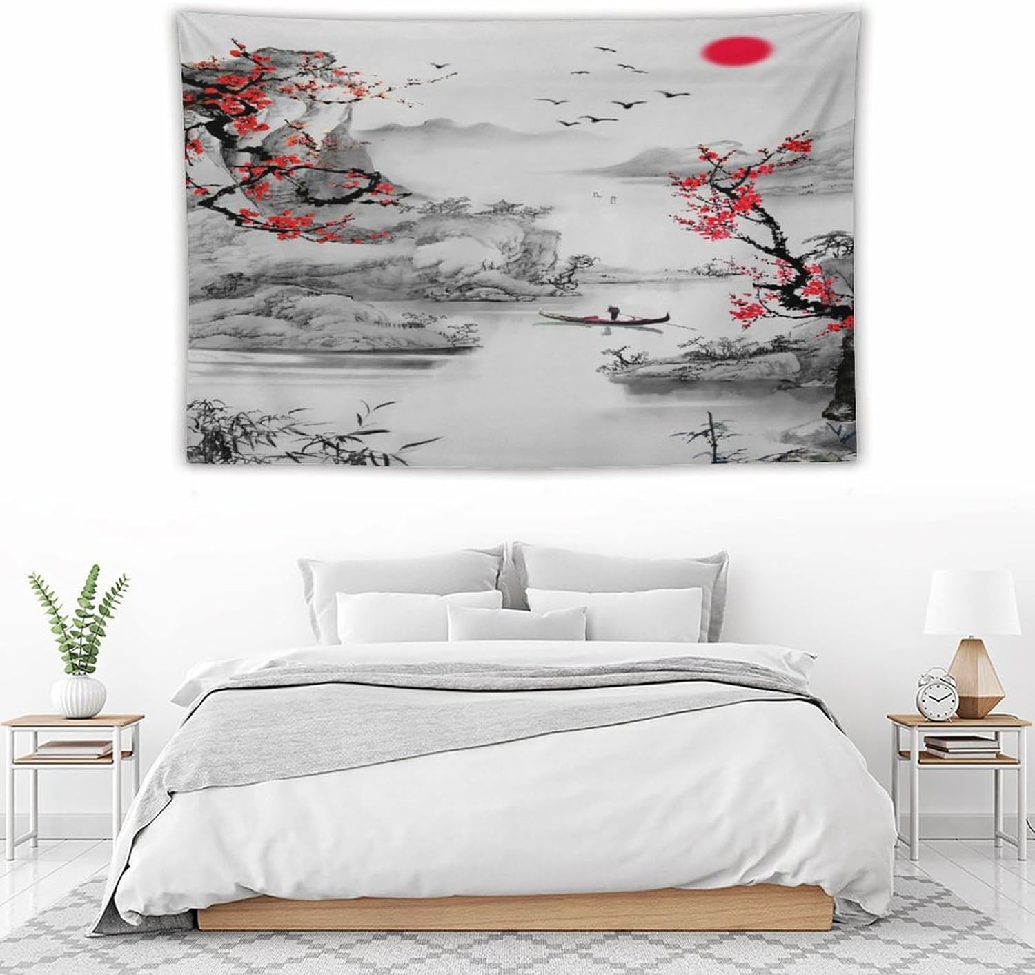 Cherry Blossoms Tapestry, Japanese Red Landscape Watercolor Abstract Art, Asian Japanese Wall Tapestry, Nature Landscape Tapestries for Bedroom Living Room Decor 90"x60"
