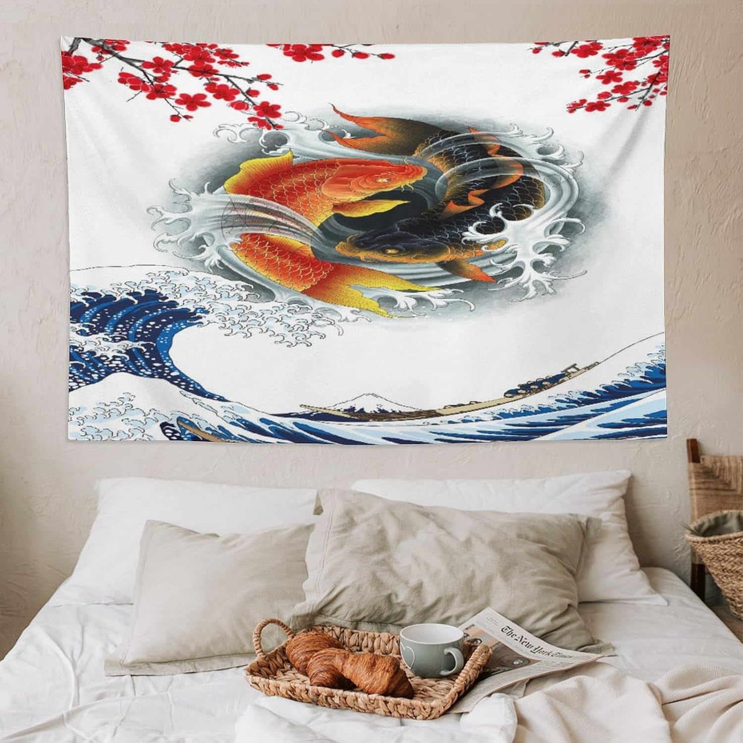 Houselerax Koi Fish Tapestry, Japanese Style Yin Yang Big Wave Cherry Blossoms Tapestries Wall Hanging for Bedroom Living Room Office Decor 90"x60"