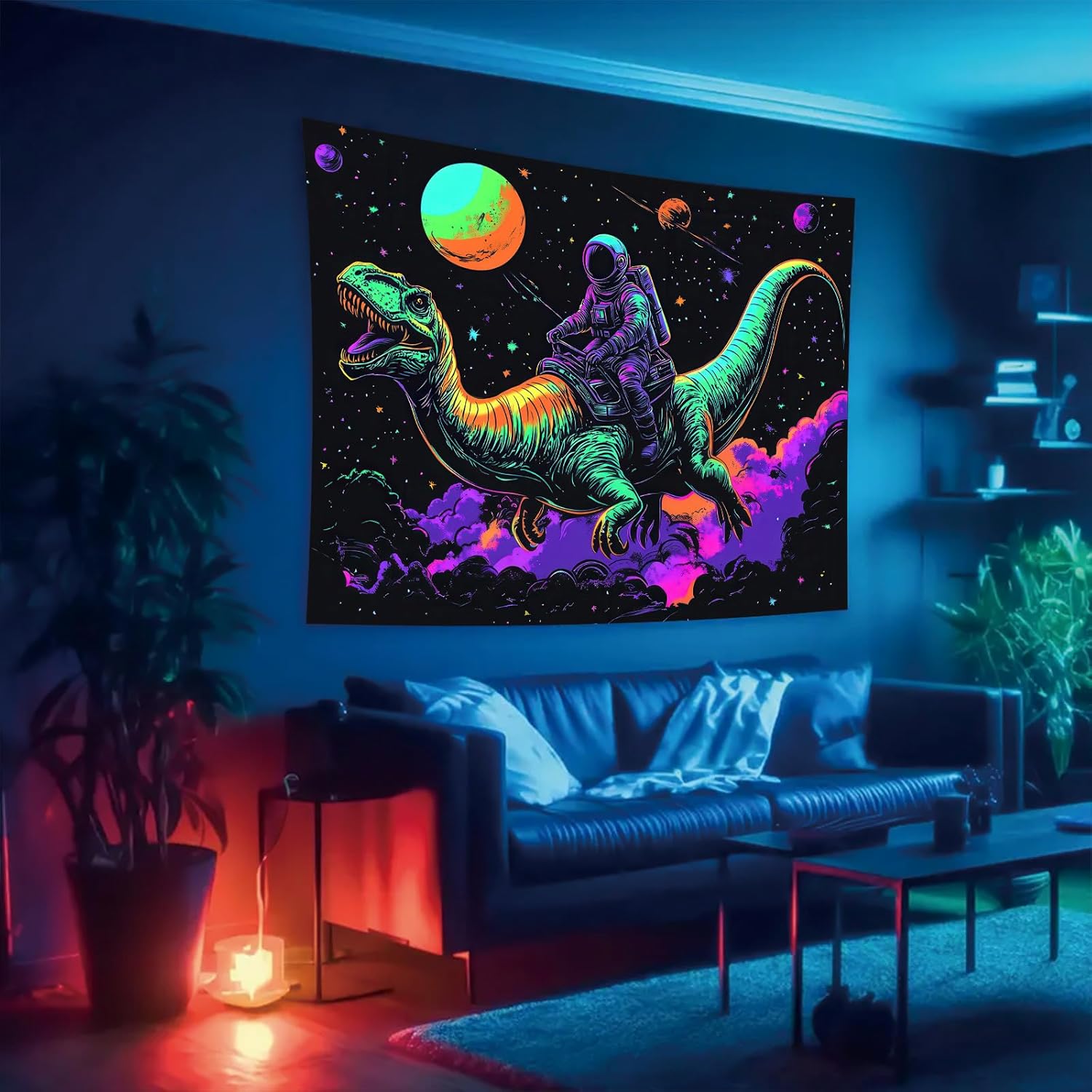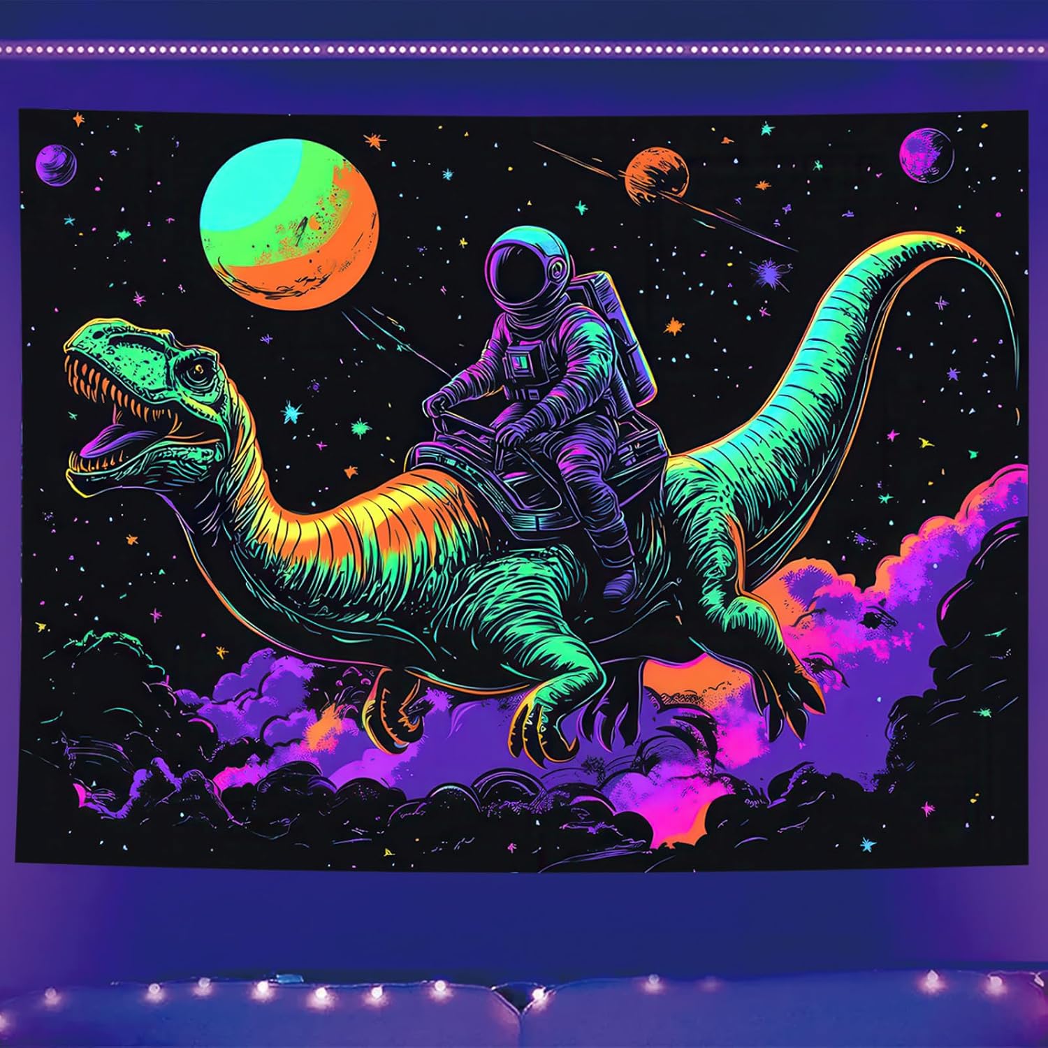 - UV Reactive Glow: This blacklight tapestry features a unique astronaut riding a dinosaur in outer space, glowing vibrantly under UV light. The neon colors and cosmic background create a fun and surreal visual experience.