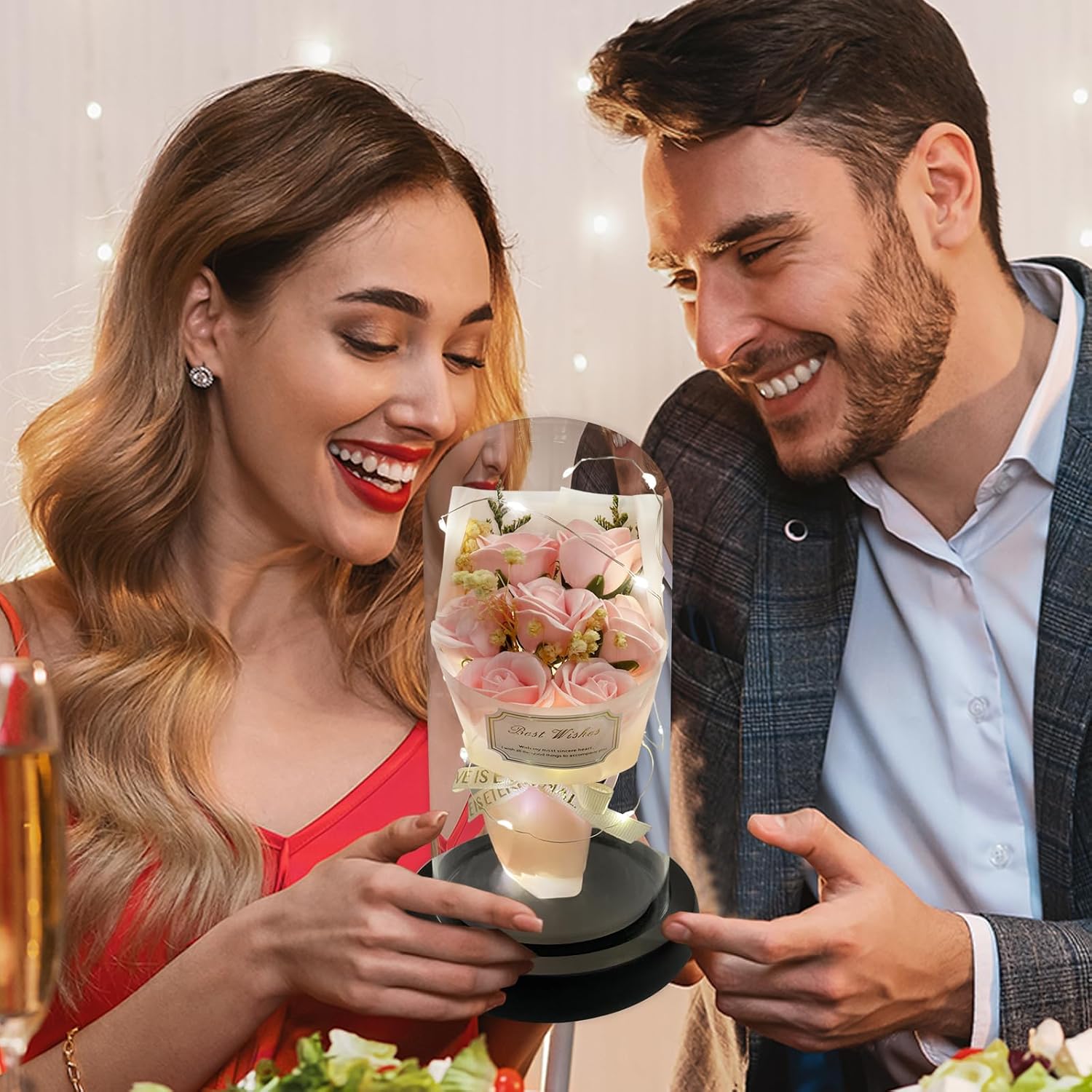 - 【Valentines Flowers Gifts Come With Happiness】:Women Gifts from daughter son. Valentines gifts for her. The twinkle lights wrapped around the flower rose bouquet in glass dome. Everyone will fascinate it when it light at romantic nigth. Get it on the special day, get happiness and sweet time.
