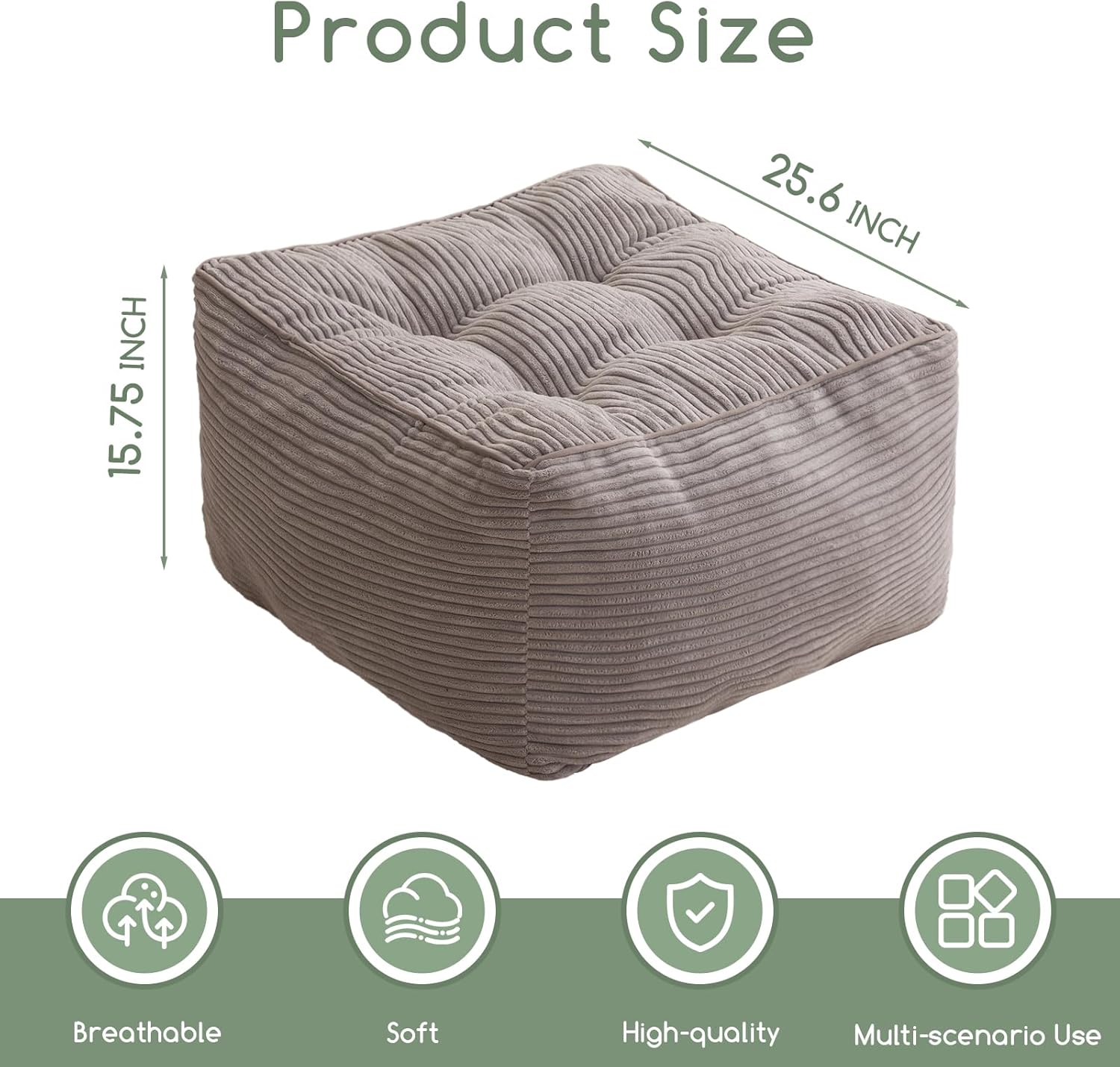 HIGOGOGO Square Stuffed Pouf Ottoman, Corduroy Poufs with Foam Chunk Filling, Furry and Fluffy Pouf Foot Stool Storage Ottoman, 25.6 X 25.6 Floor Poufs Foot Rest for Living Room, Grey