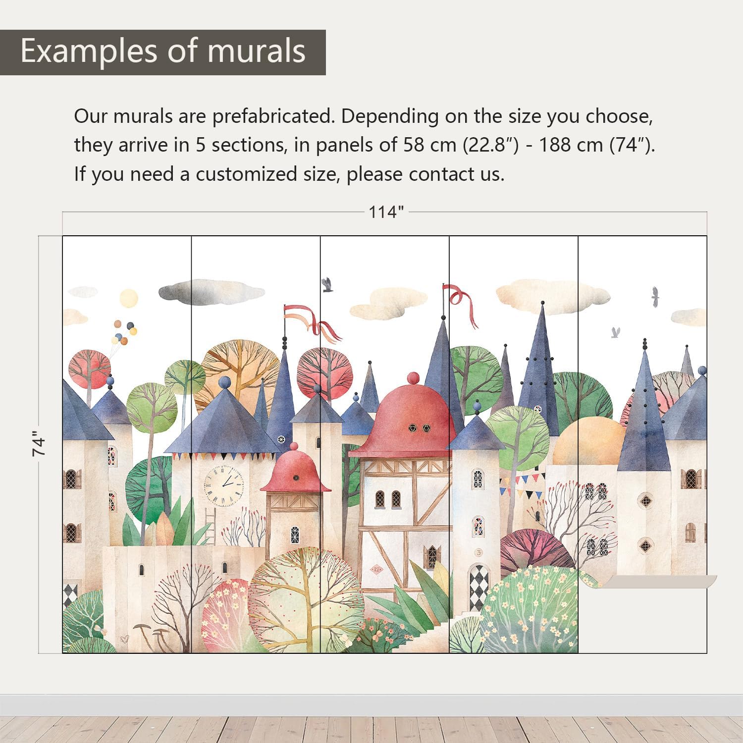 - Size note: Mural measures 114"W x 74"H and is divided into 5 sections, each section is labeled with a number underneath, eliminating the need to overlap patterns when installing.