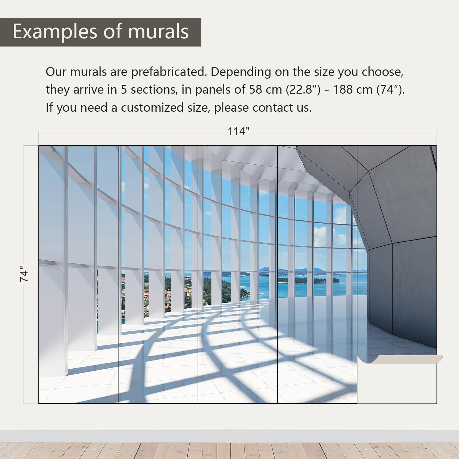 - Size note: Mural measures 114"W x 74"H and is divided into 5 sections, each section is labeled with a number underneath, eliminating the need to overlap patterns when installing.