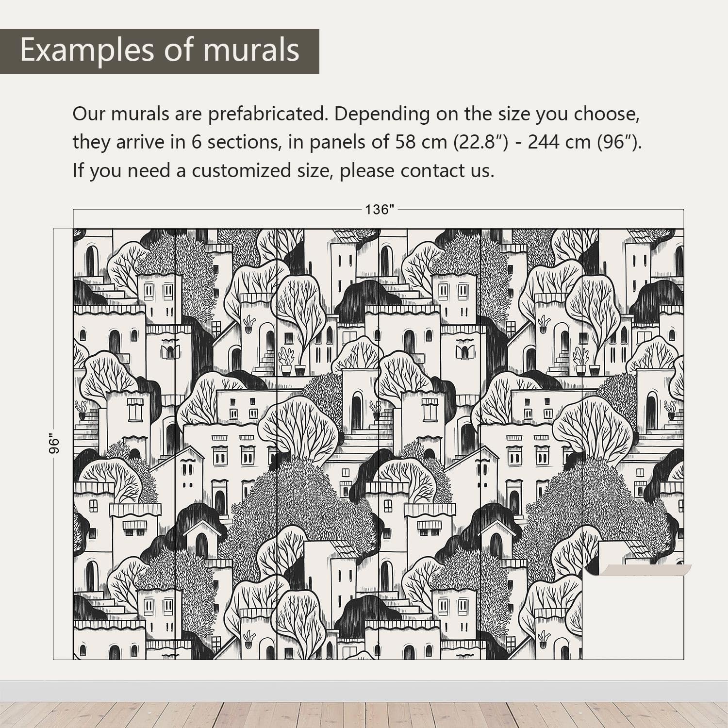 - Size note: Mural measures 136"W x 96"H and is divided into 6 sections, each section is labeled with a number underneath, eliminating the need to overlap patterns when installing.