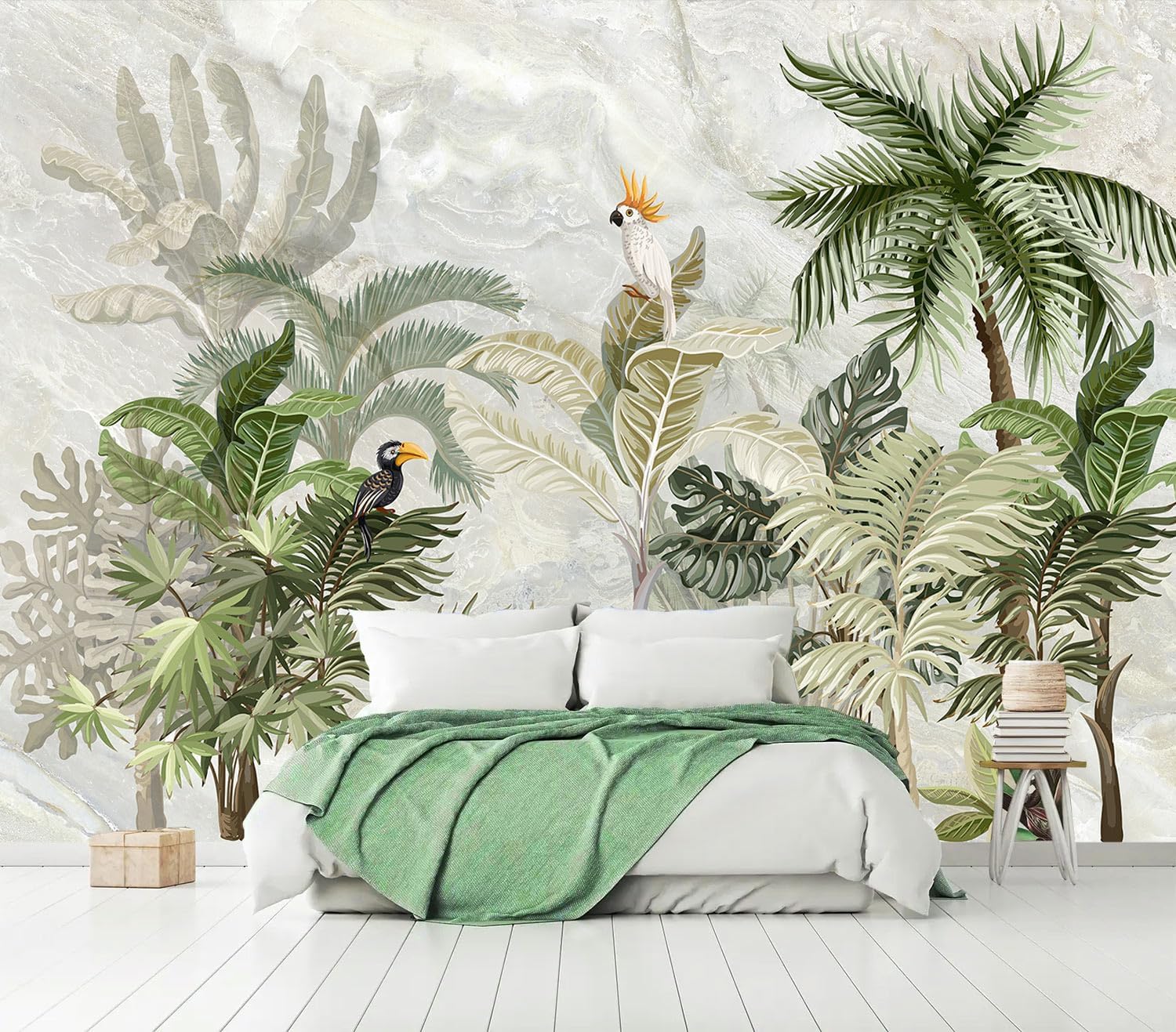 AFZEVEB-Green Forest Nursery Wallpaper Tropical Parrots Wall murals for Kids Room 136"x96" (Not Peel and Stick)