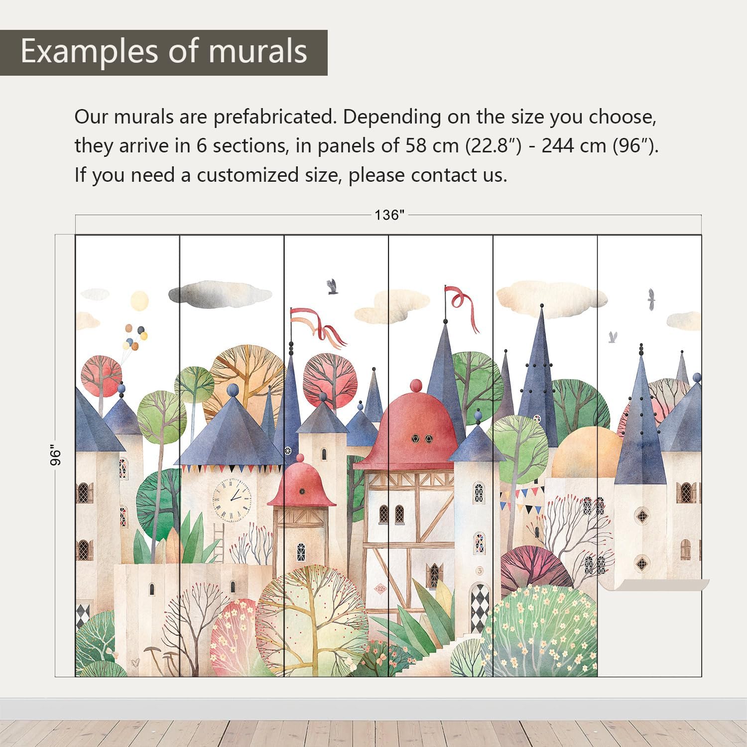 - Size note: Mural measures 136"W x 96"H and is divided into 6 sections, each section is labeled with a number underneath, eliminating the need to overlap patterns when installing.
