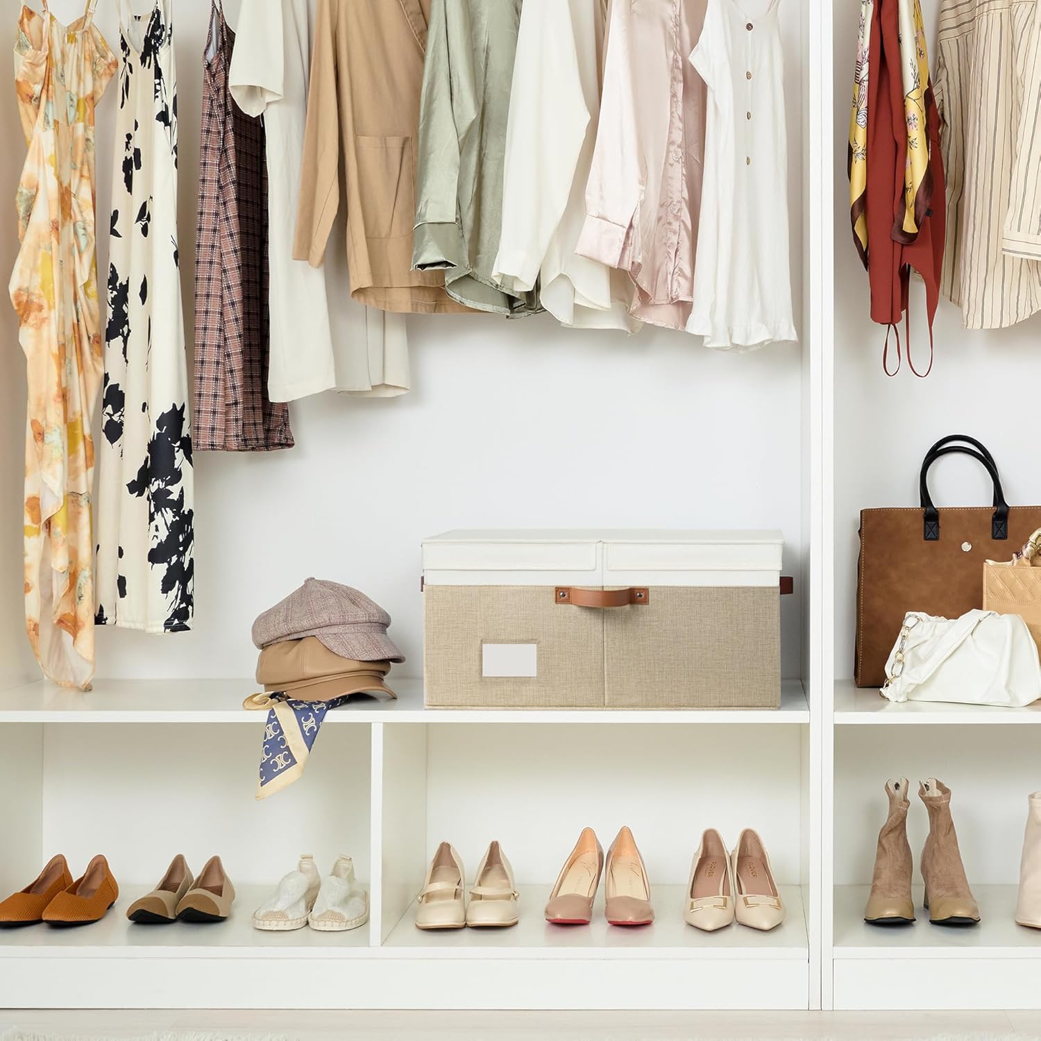 GRANNY SAYS Decorative Storage Boxes with Lid, Large Storage Bins with Double-Open Lid and Divider, Fabric Storage Bin for Clothes, 63L Closet Linen Storage Bin, White/Khaki