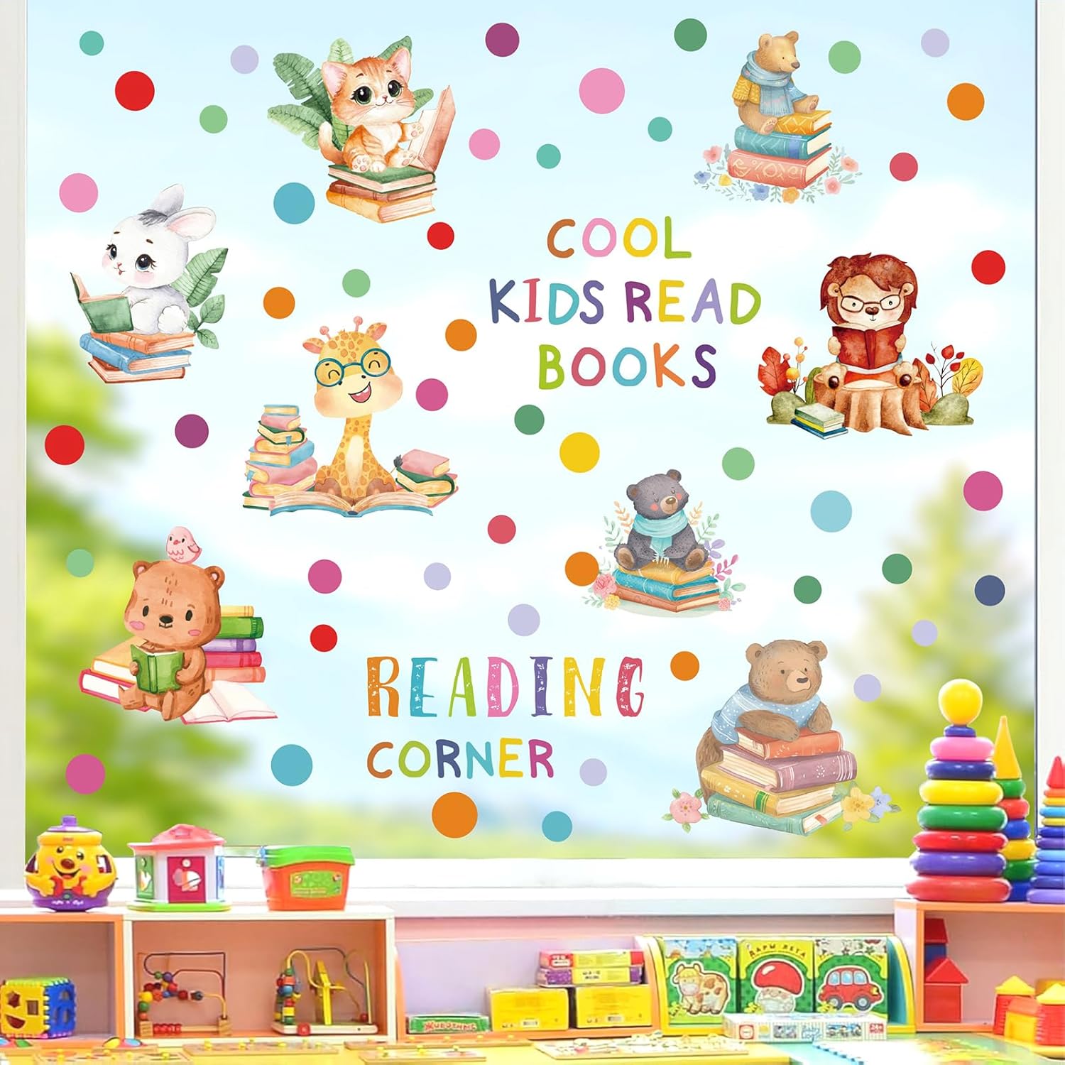 - Reading Corner Wall Stickers: This read books wall decal is mainly composed of various cartoon animals,such as giraffe bear rabbit lion cat.With the word [Reading corner cool] [KIDS READ BOOKS].This study wall stickers will add a study atmosphere to your school or home