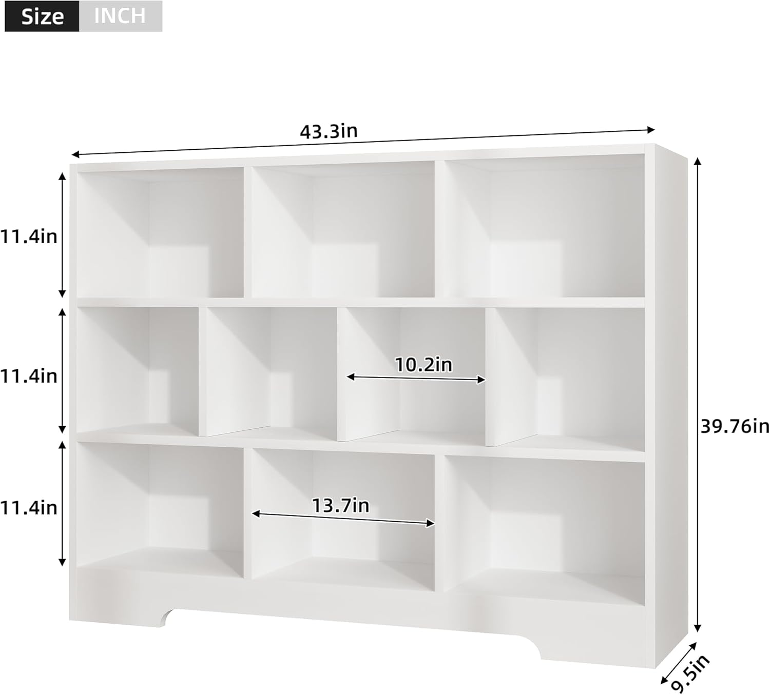 - 【Durable Bookshelf】Overall dimensions: 43.3”L x 9.4”W x 39.8”H. This Cube Storage Organizer is crafted from MDF board, which is durable and sturdy. The thick bottom base is designed to strengthen the stability.