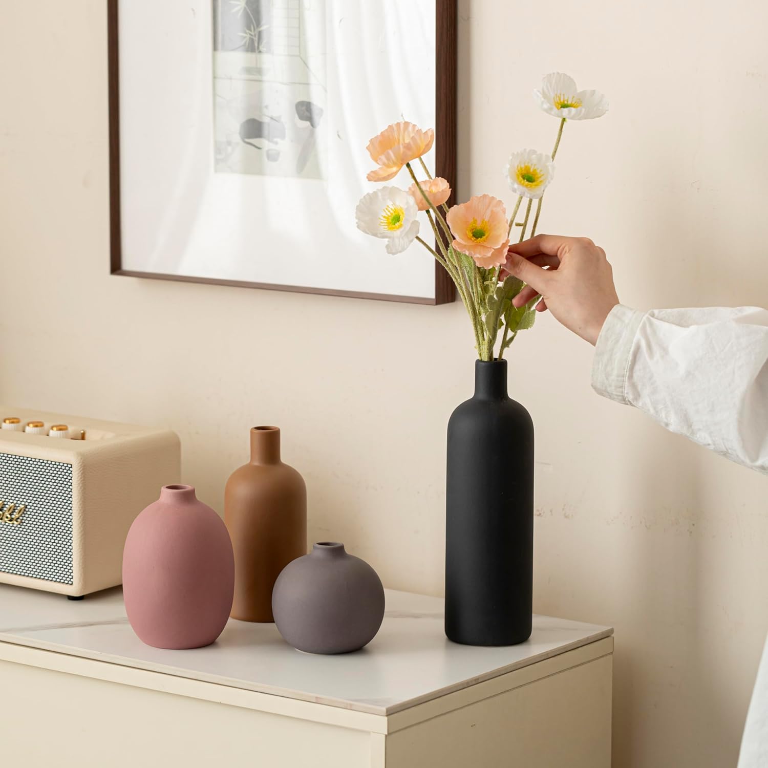 - VERSATILE SET: Collection includes 4 uniquely shaped ceramic vases in complementary neutral tones - Black, brown etc for a cohesive look