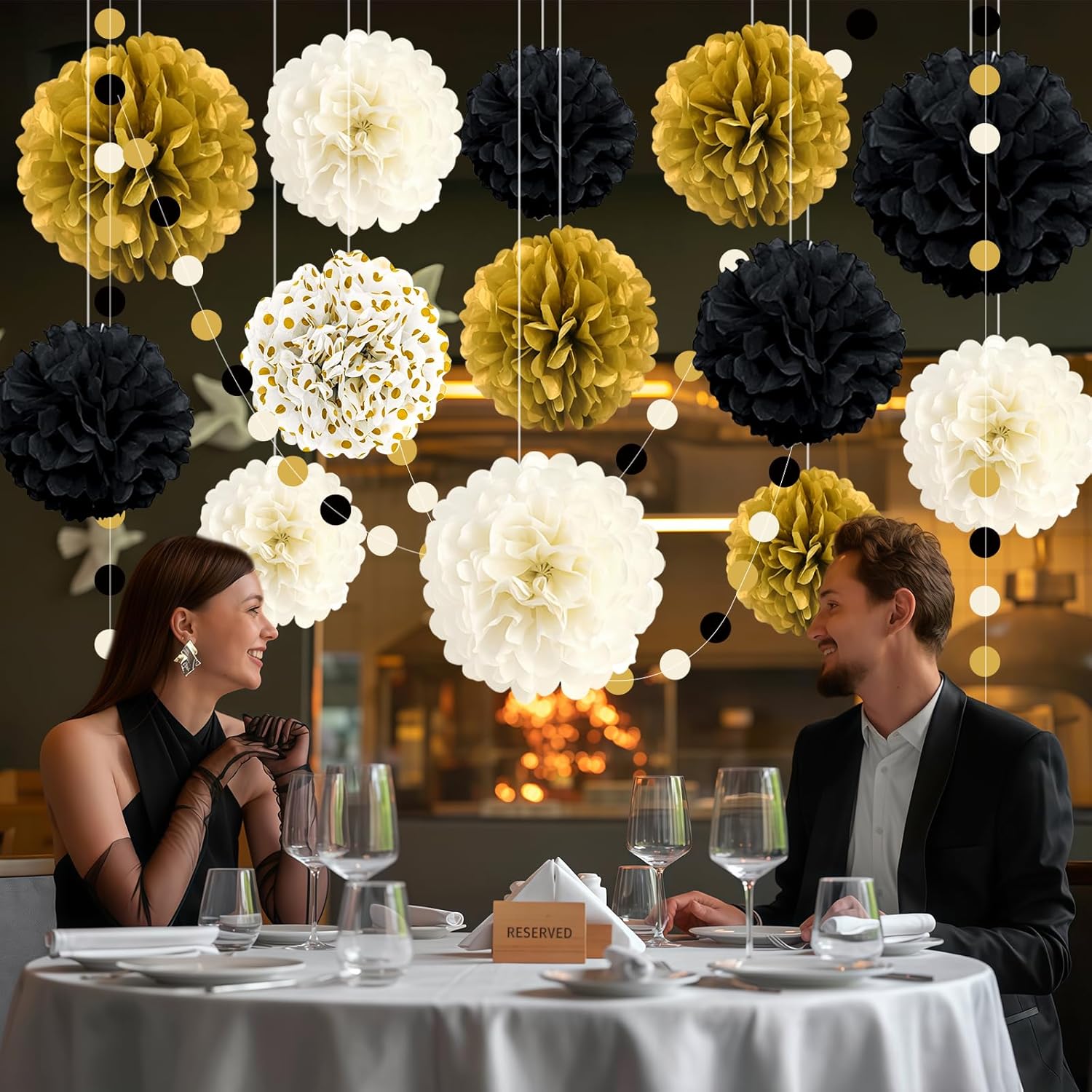 Black and Gold Party Decorations, 16 PCS Tissue Paper Pom Poms Dots Paper Garland Kit for New Year Party, Graduation, Wedding, Birthday, Engagement, Baby Shower, Retirement Party Decor
