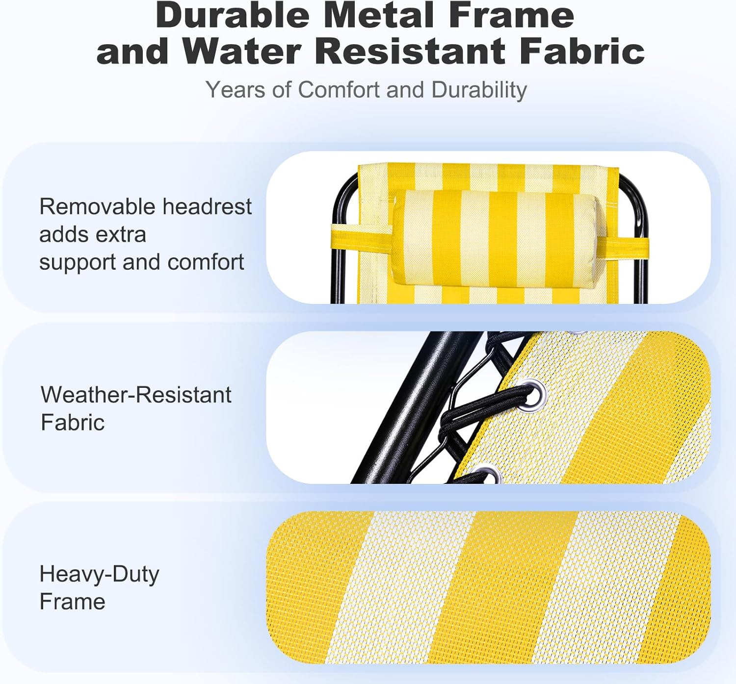- PORTABLE DESIGN: Lightweight and foldable, our Lounge Chairs are easy to take with you on the go, whether you're heading to the beach, park, or your child's next sporting event.