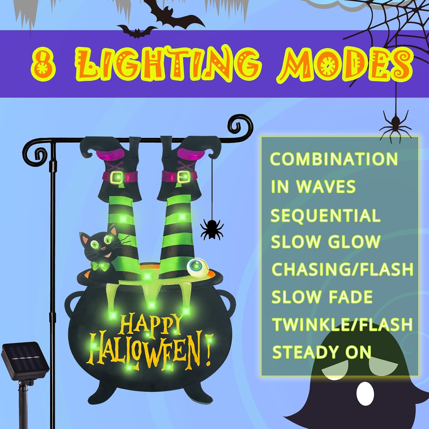 Halloween Lighted Garden Flag for Outside, Witch Feet Shape Flag Yard Decor, 8 Modes 12x18 Double Sided Cauldron Eyeball Black Cat Outdoor Hlloween Decorations for Home Porch
