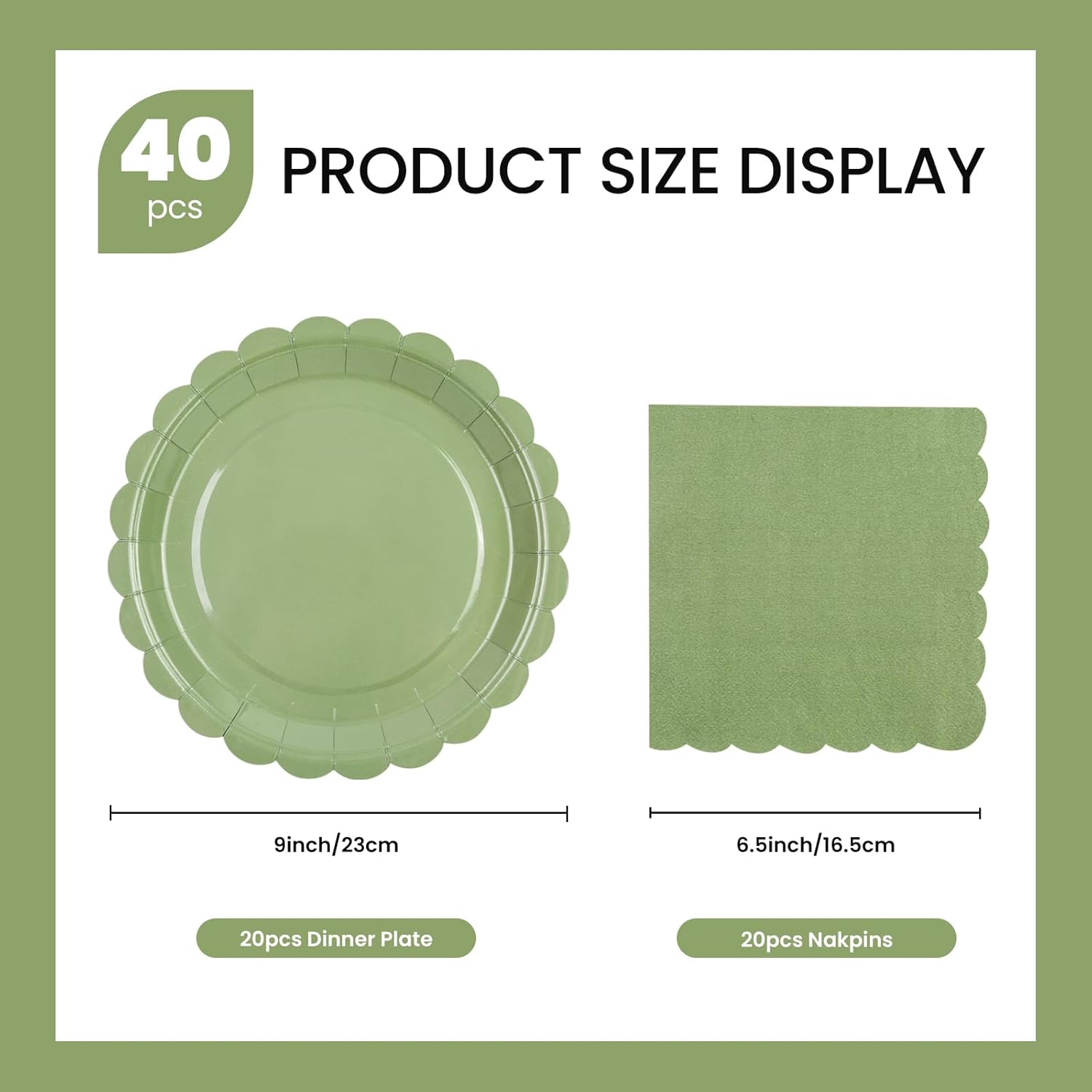 - Complete Set: Enjoy a hassle-free party with our 50 pcs sage green scalloped paper plates party supplies set that includes9 inch 20 pcs dessert plates & 20 pcs napkins.Perfect for any party or everyday use, enough to decorate a fabulous and unique party!