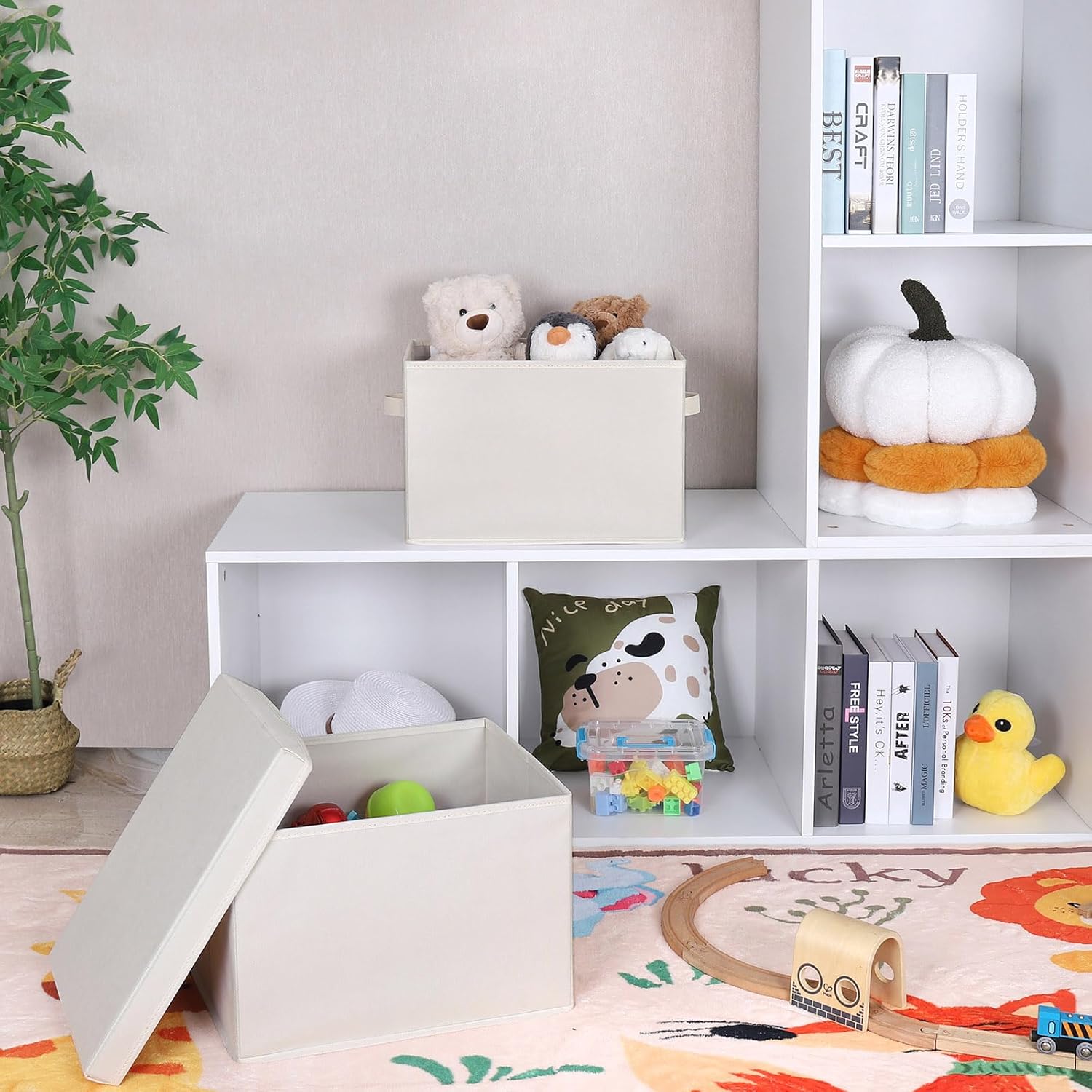 - Practical Design: The fabric storage bin features a lid to minimize dust entry, two sturdy side handles for easy portability, and a collapsible construction that saves space.