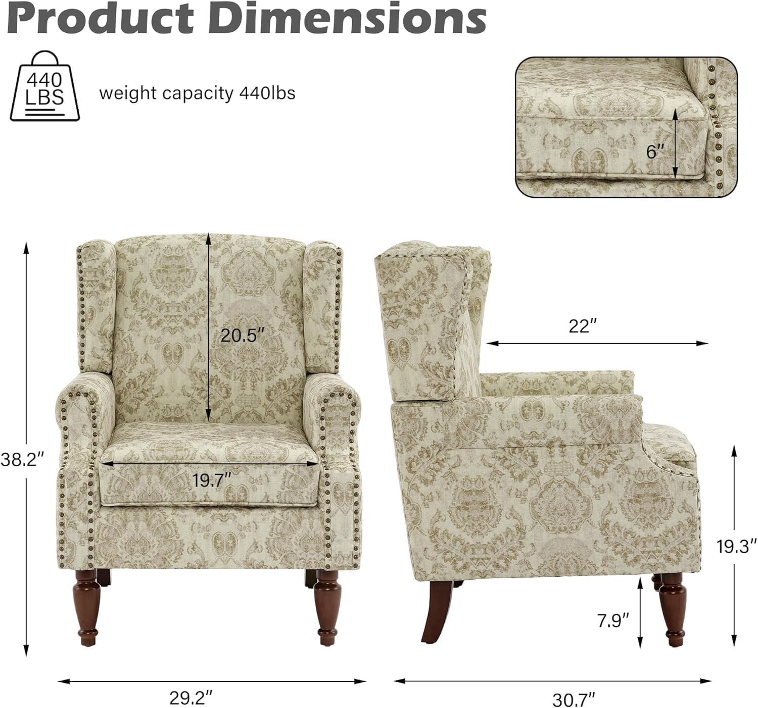 - Overall Product Dimension - 30.5"D x 29"W x 38"H. Seat Dimension: 22"D x 19.5"W x 19.2"H. Weight capacity: 400 lbs. The spaciousness creates a comfortable environment for resting or working. ATTENTION: Take the backrest Right Wing and Left Wing out from the bottom space of seat.