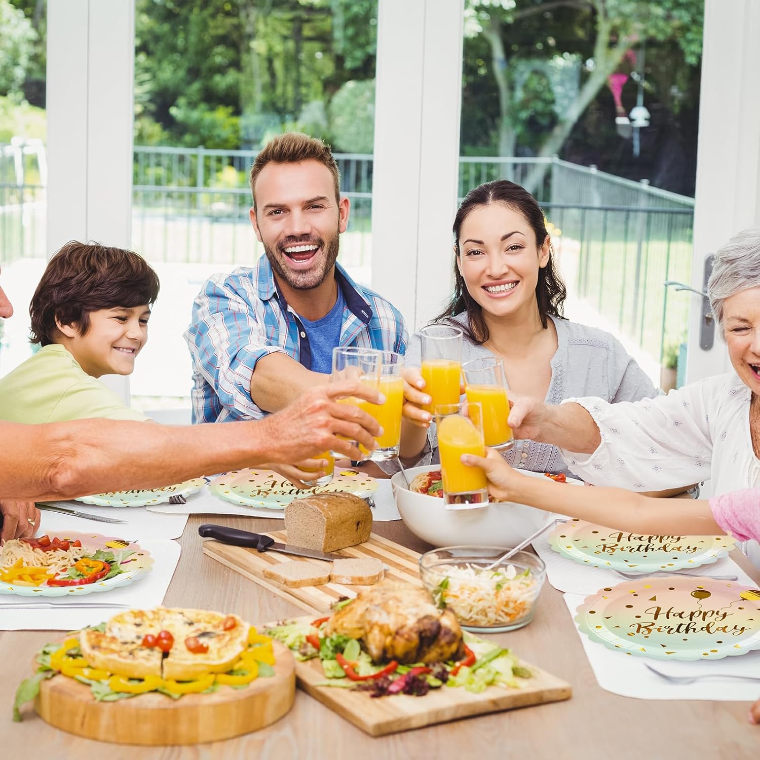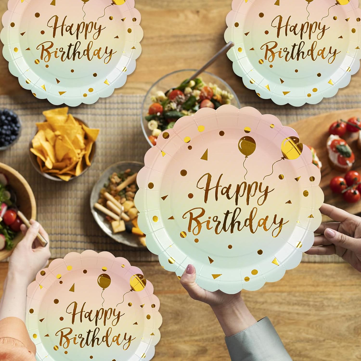 - 【EXQUISITE DESIGN】:Eye-catching gold foil stamping of 'Happy Birthday' in stylish fonts adorns these birthday dessert plates and the rising balloon signifies growing goodness. It adds a touch of elegance and festivity, making your birthday party table instantly stand out.