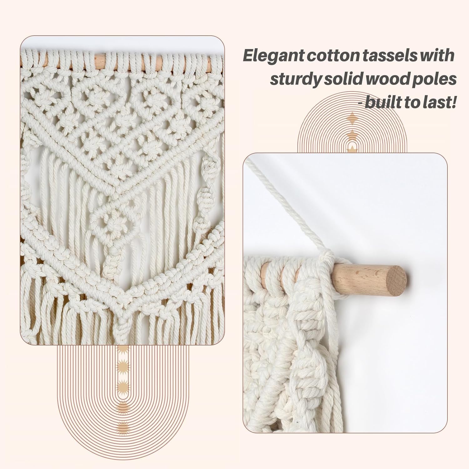 - 【Easy To Hang】 Our macrame decor comes with a wooden rod and pre-attached tassels,all you need is a hook making it easy to hang on any wall.Size: 19.6in x 27.6 in (width:Dimensions of wood poles) length:from top to the ends of longest fringe).Because the macrame is a handwoven item, there may be a 1-2 inch deviation of size existing between them.