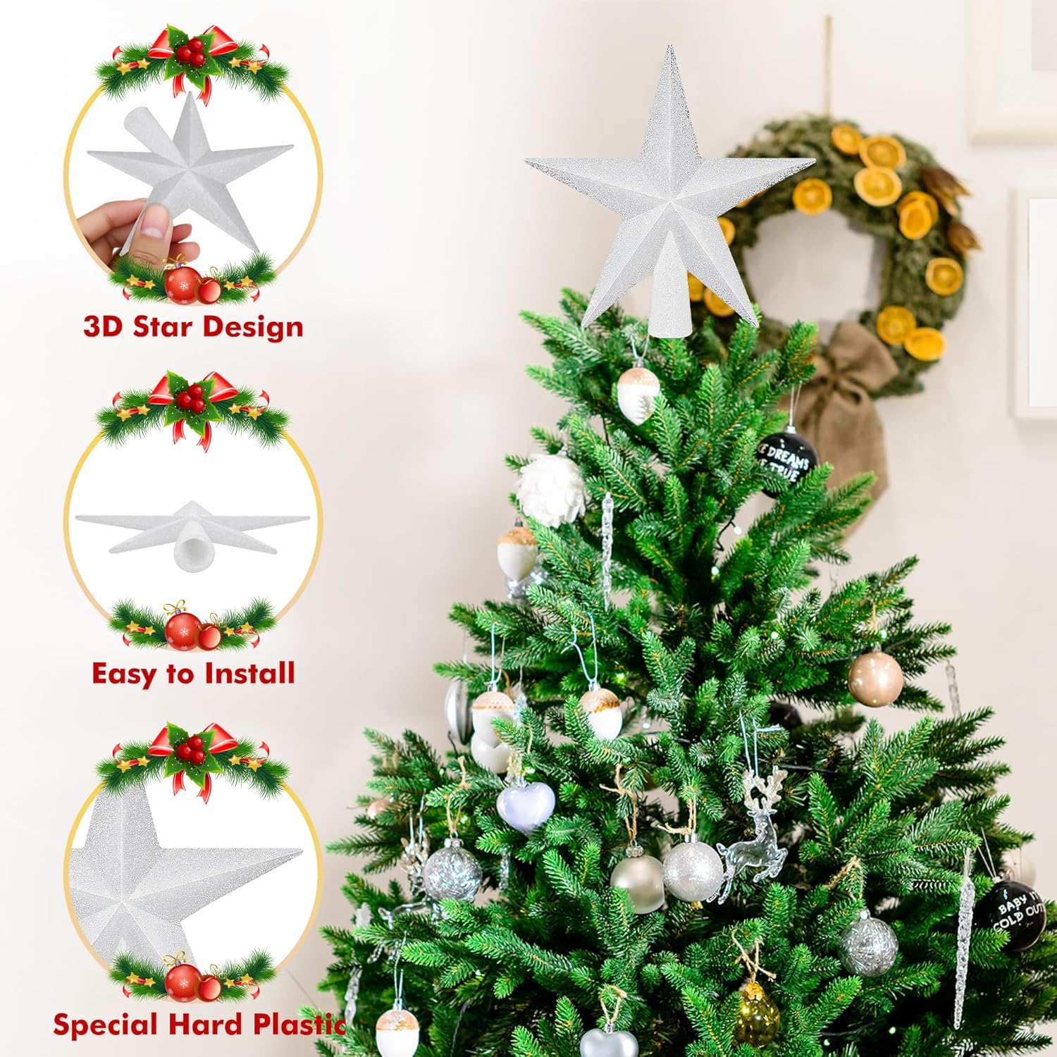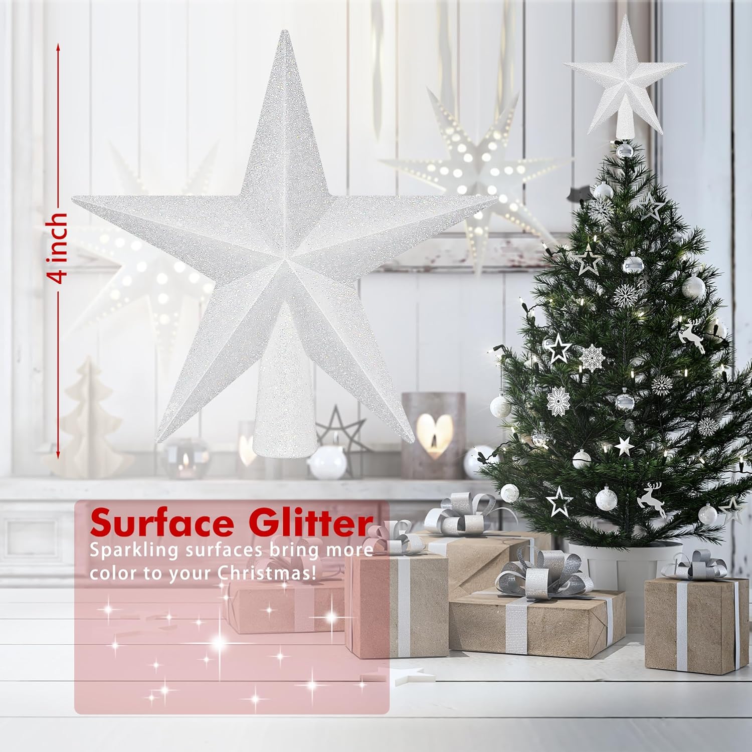 Christmas Tree Topper, 1PCS 4" White Glitter Star Tree Topper, 3D Xmas Shatter-Proof Mini Bethlehem Star Tree Topper Decorations, Waterproof Christmas Decor for Holiday Home Outdoor Ornament