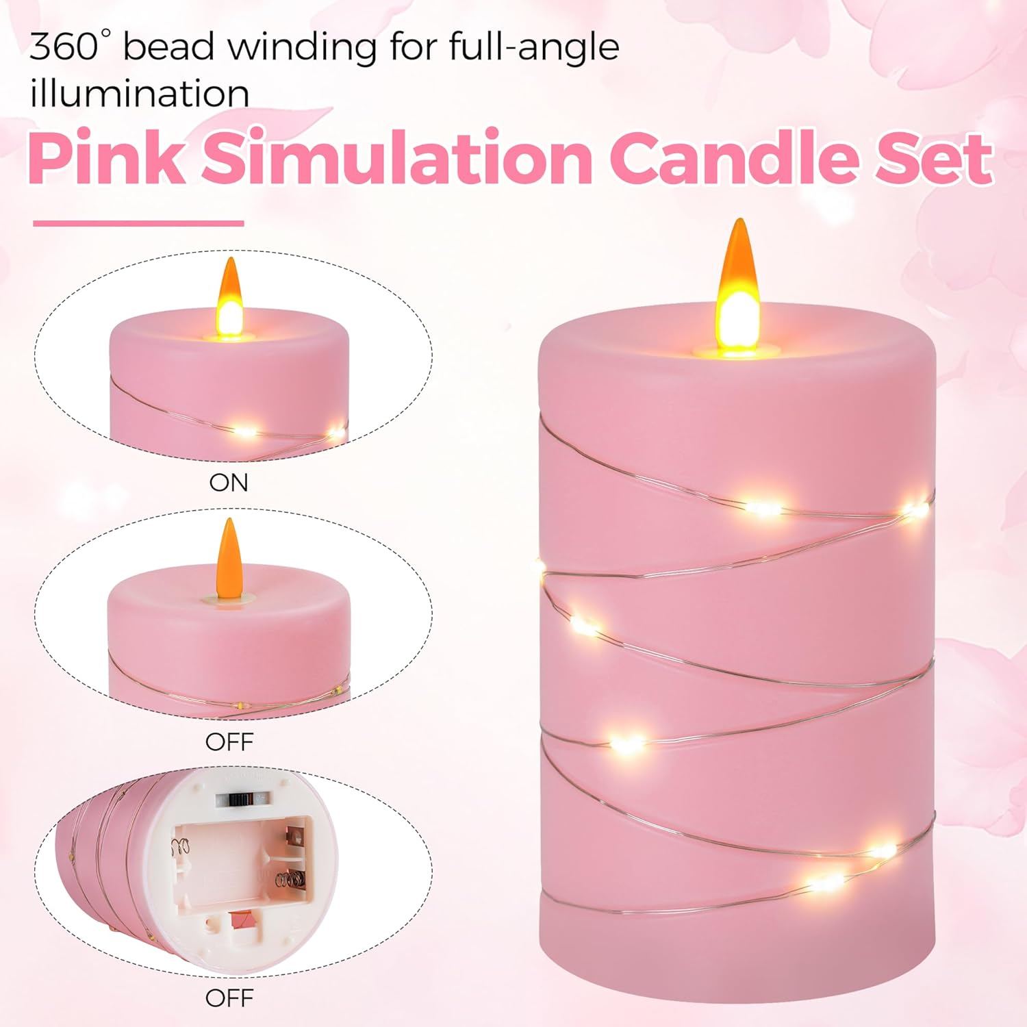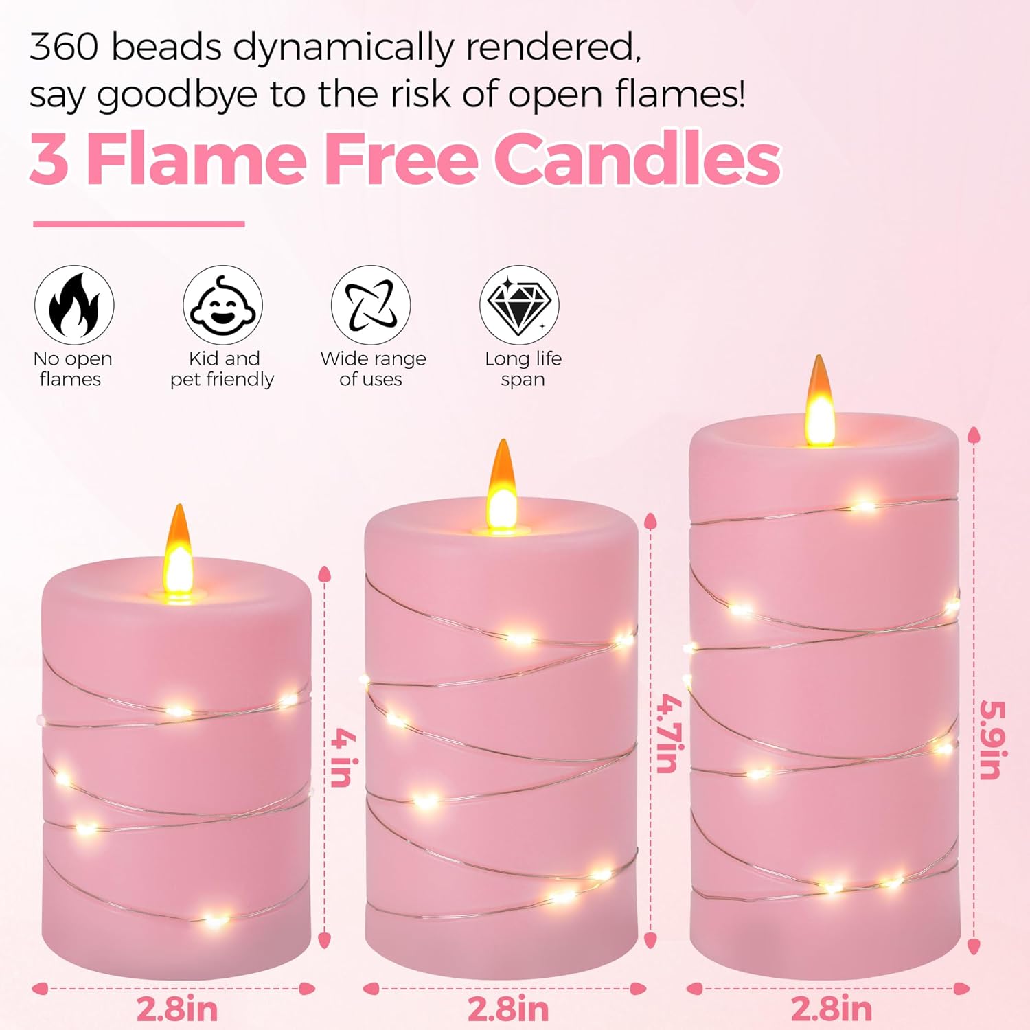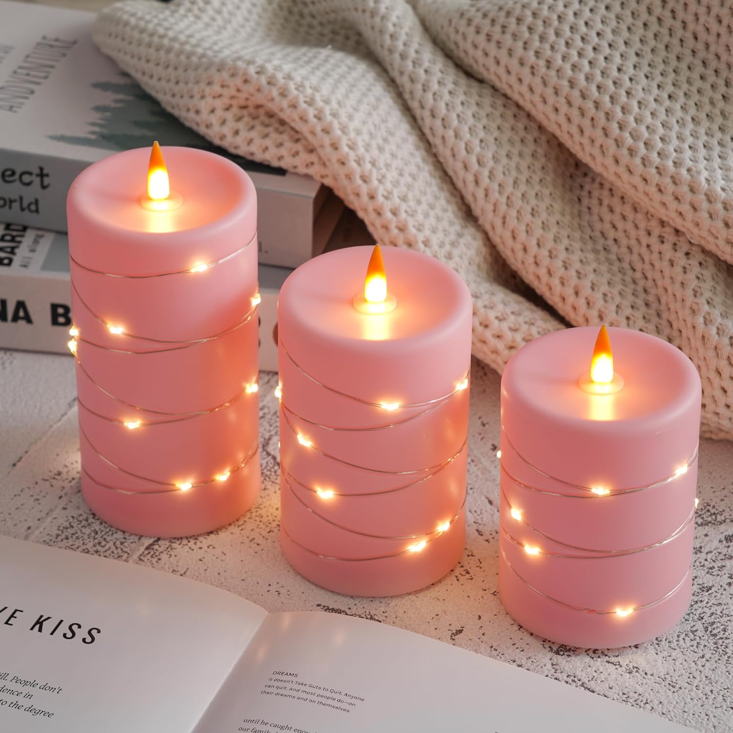 Rose Pink Flameless Candles with String Lights Battery Operated Flickering LED Pillar Candles 4‘’ 5‘’ 6‘’ Candle with Remote Control, Set of 3