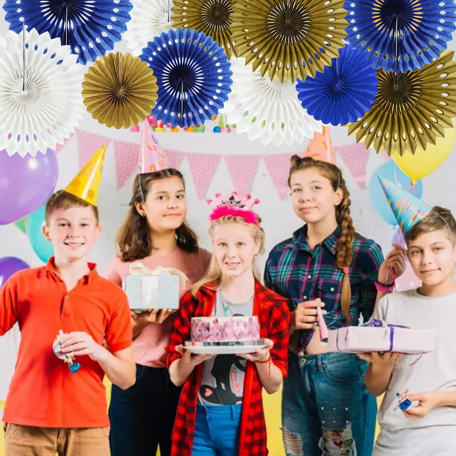 - Hanging decoration kit】 honeycomb paper fan set includes 11 paper fans of different sizes, among which the paper flower fan size is 16 inches * 3, 12 inches * 3, 8 inches * 3, 6 inches*2,color include blue,gold,white.