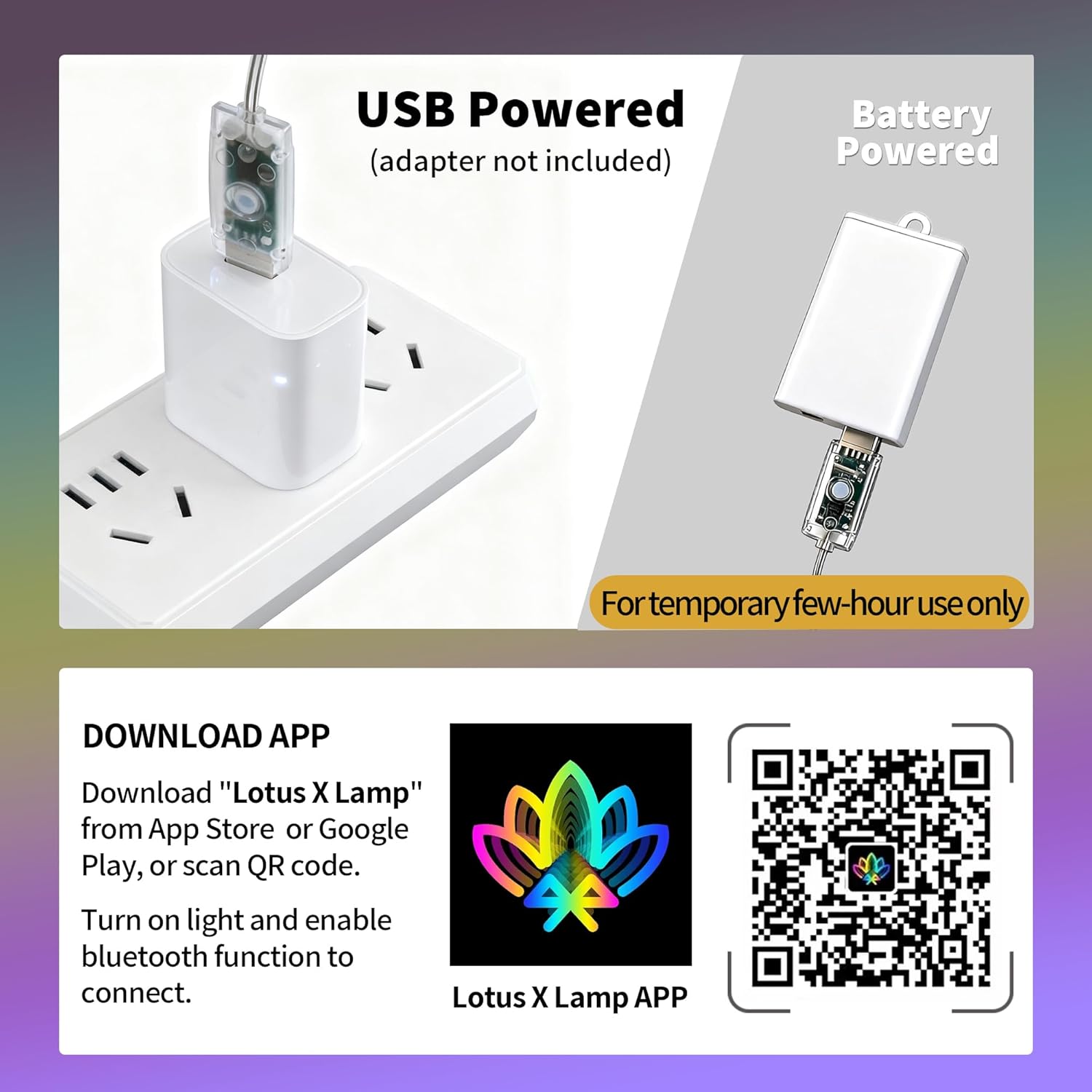 - USB Powered: Optimized for vivid color-changing effects, this color-changing light works best with any 5V, ≥1A USB port—plug into an adapter for seamless, long-lasting use. The AA battery pack is provided for temporary or emergency use only