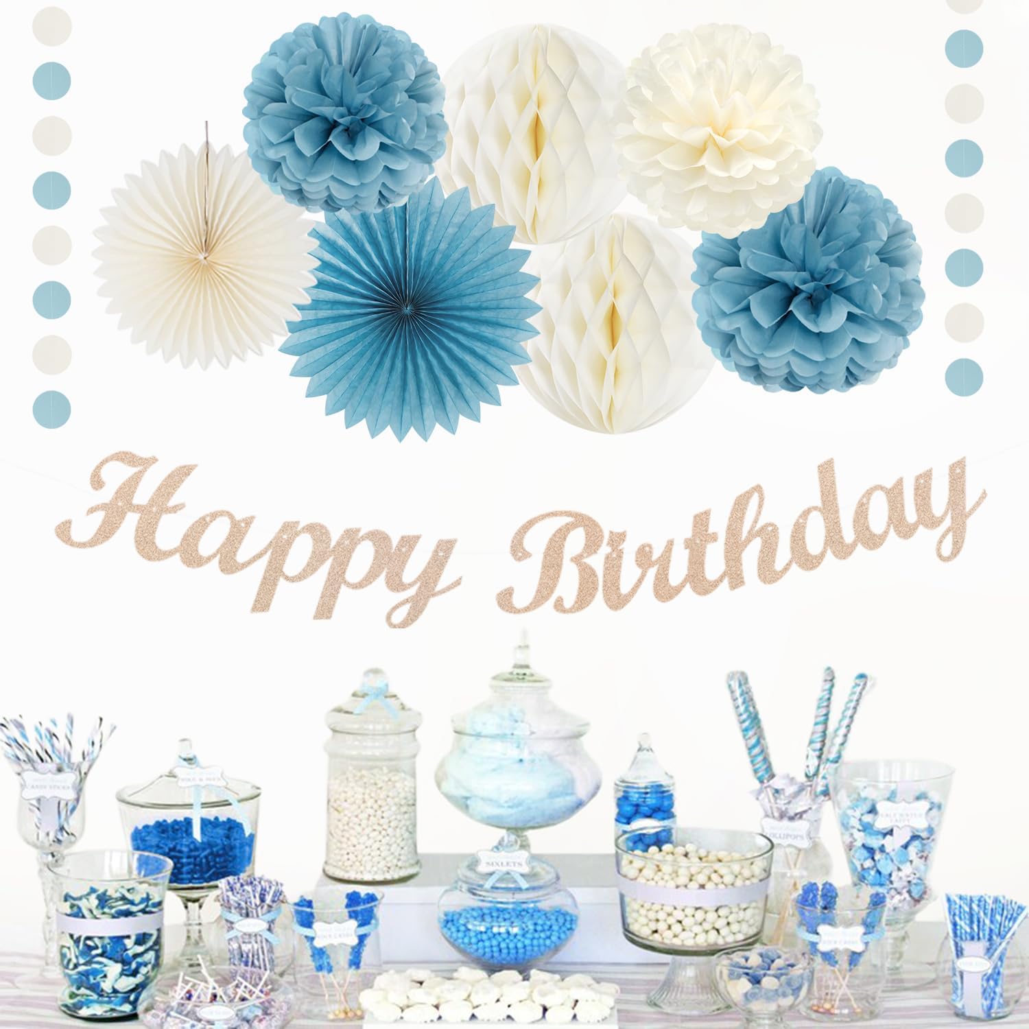 - 【Dusty blue white birthday decorations kit includes】The party decorations kits include 8pcs dusty blue white paper flower, 2pcs light blue paper fans,2pcs 8" white paper Honeycomb, happy birthday garland and dusty blue white streamers.