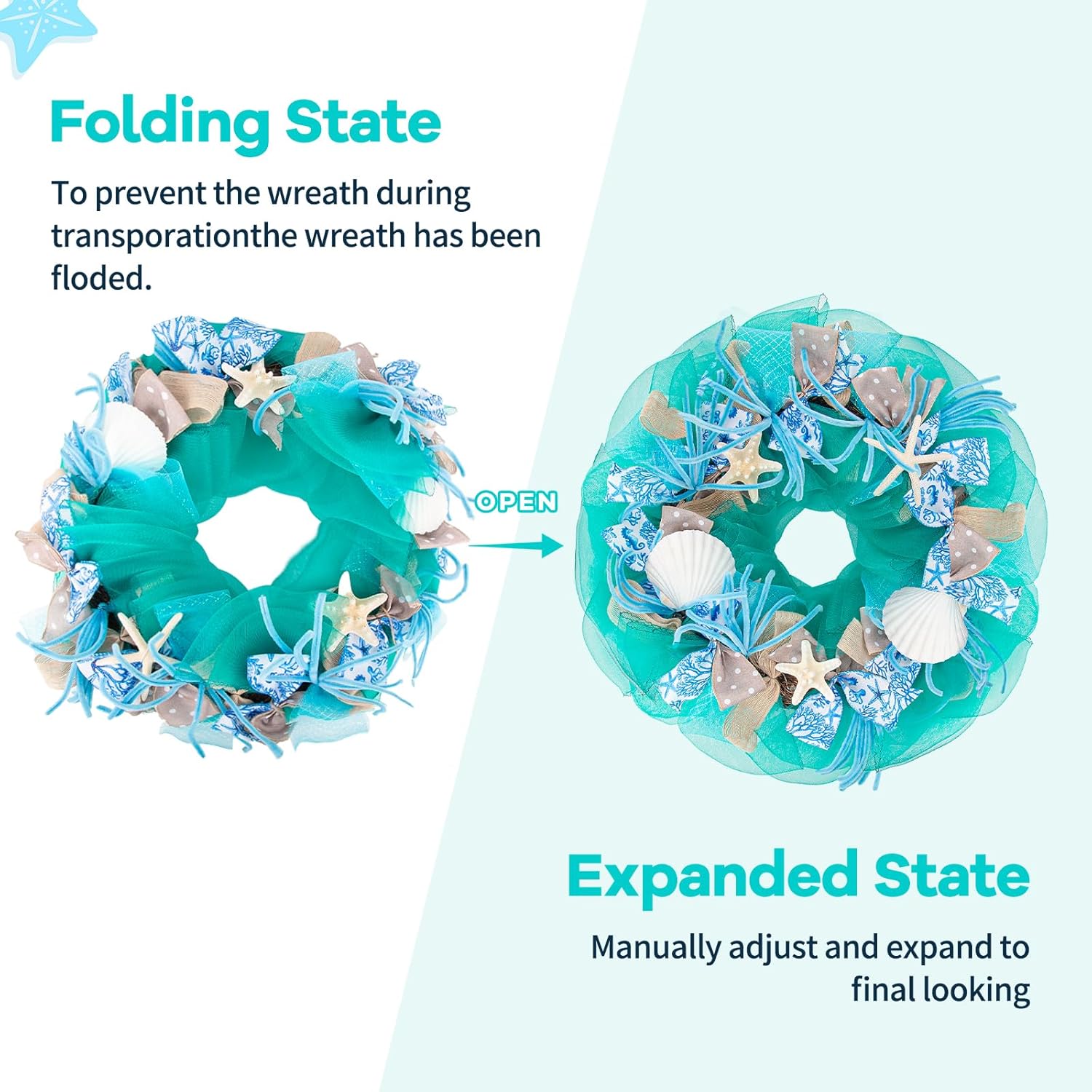 - 【Ideal for Weddings & Coastal Decor】With its elegant ocean motif, this wreath makes a charming addition to beach weddings, bridal showers, or coastal farmhouse homes. Hang it on entry doors, chairs, windows, or cars to enhance your celebration with seaside style.