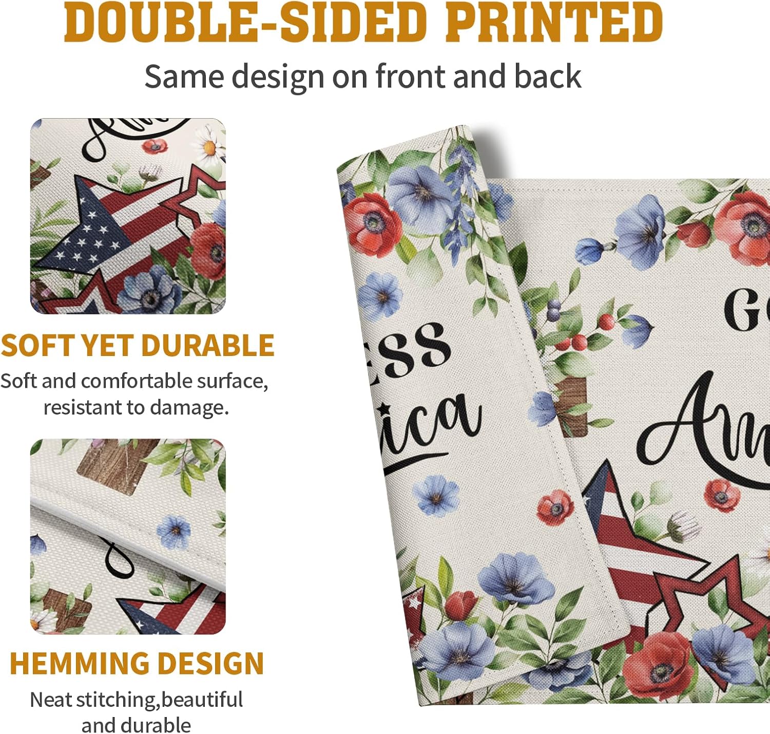 4th of July Placemats Set of 4 Patriotic Floral Cross Stars Independence Memorial Day Place Mats 12x18 Inch God Bless America Linen Fabric Table Mats for Party Kitchen Dining Decoration