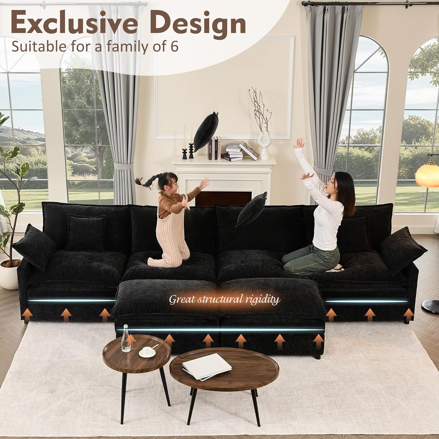 142.5" U Shaped Couch, Modular Sectional Sofa, 3-Seater Comfy Cloud Couch with Movable Ottoman, Deep Seat Couches for Living Room, Chenille, Black