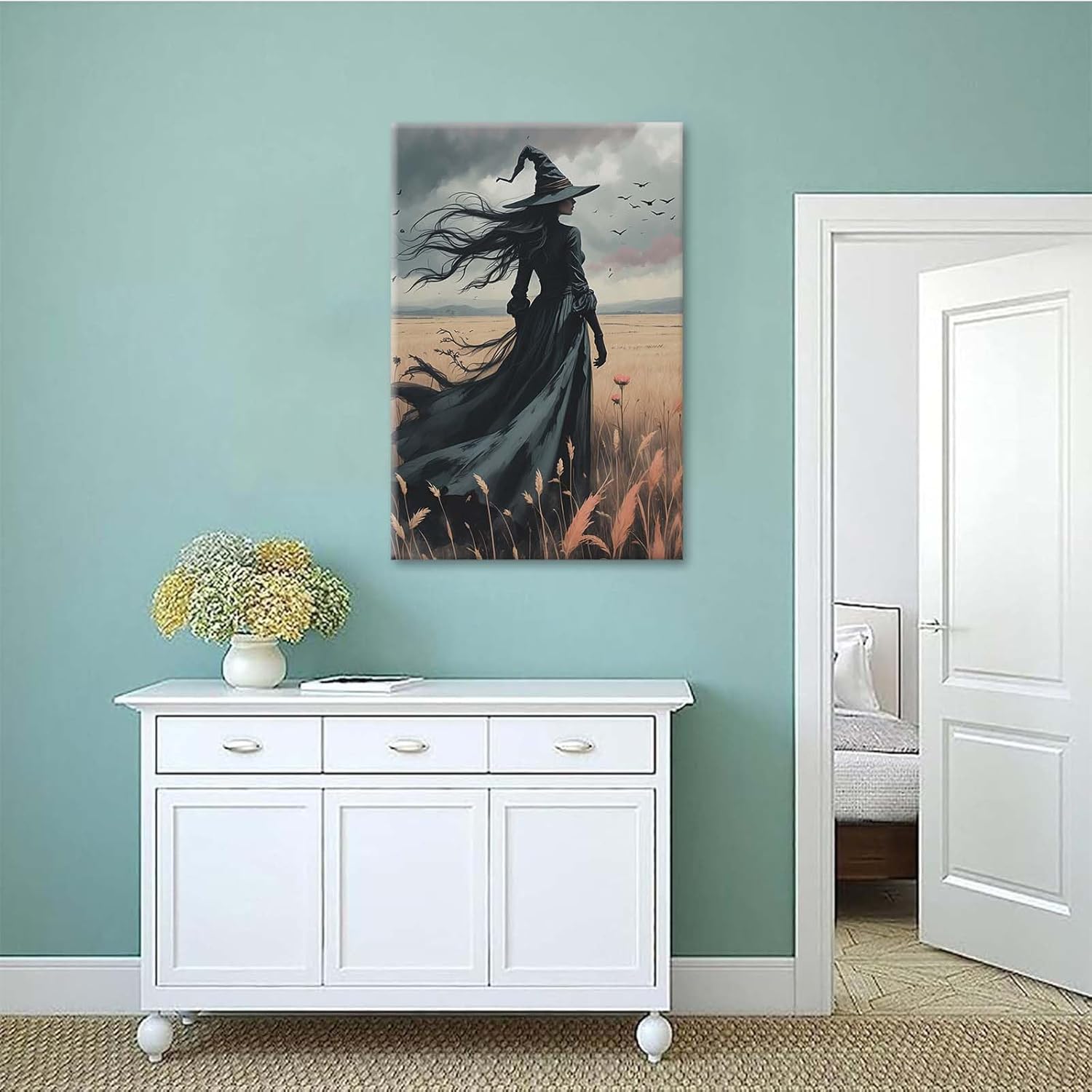 Gothic Decor Canvas Wall Art Witch in Rice Field Halloween Art Decor Print Nature Print Victorian Home Bedroom8x12in Wood Framed