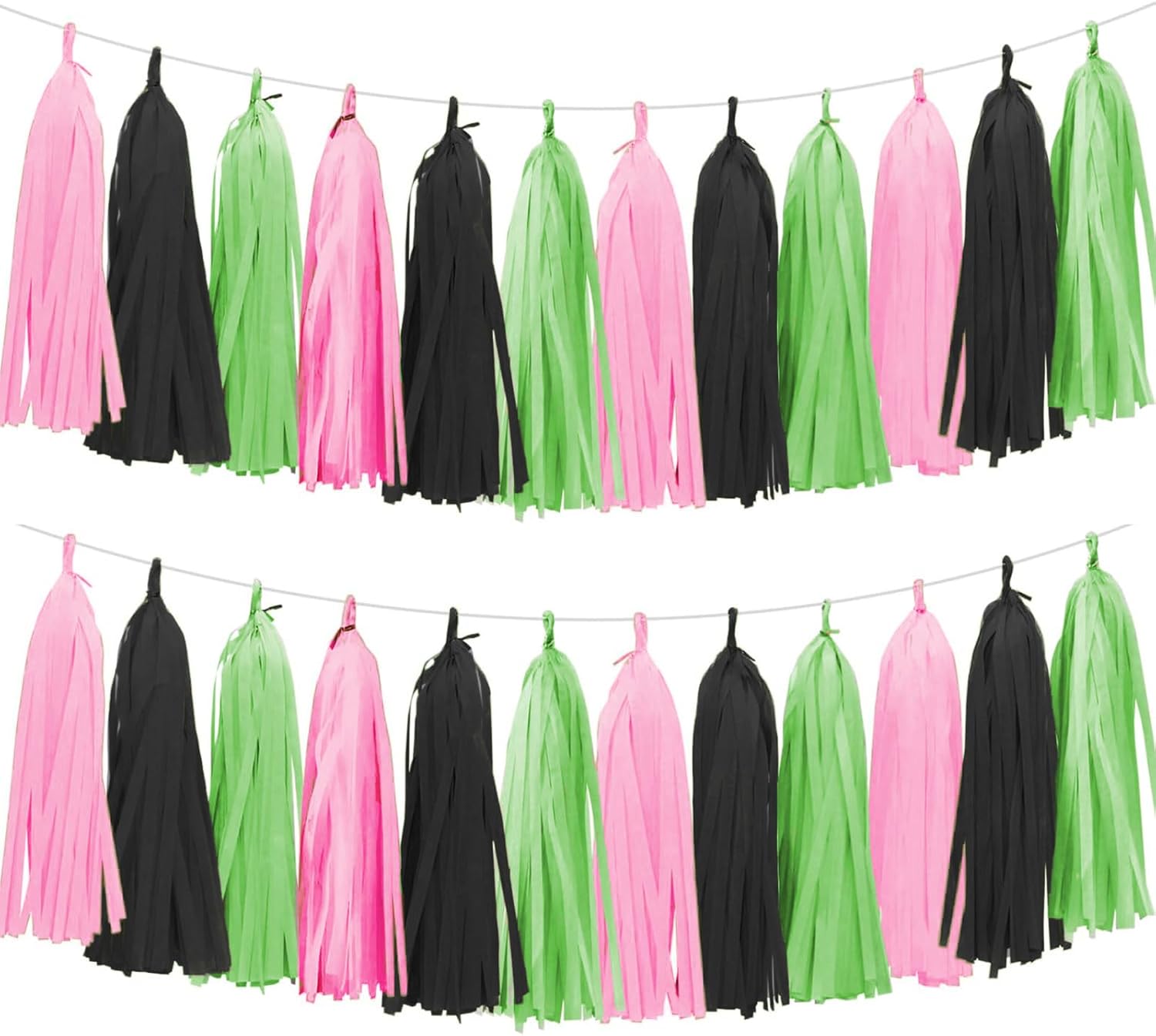 - PACKAGE CONTENTS: Set of 15 tissue paper tassels in pink , green, black, a 6-foot twine for easy hanging and instant decoration