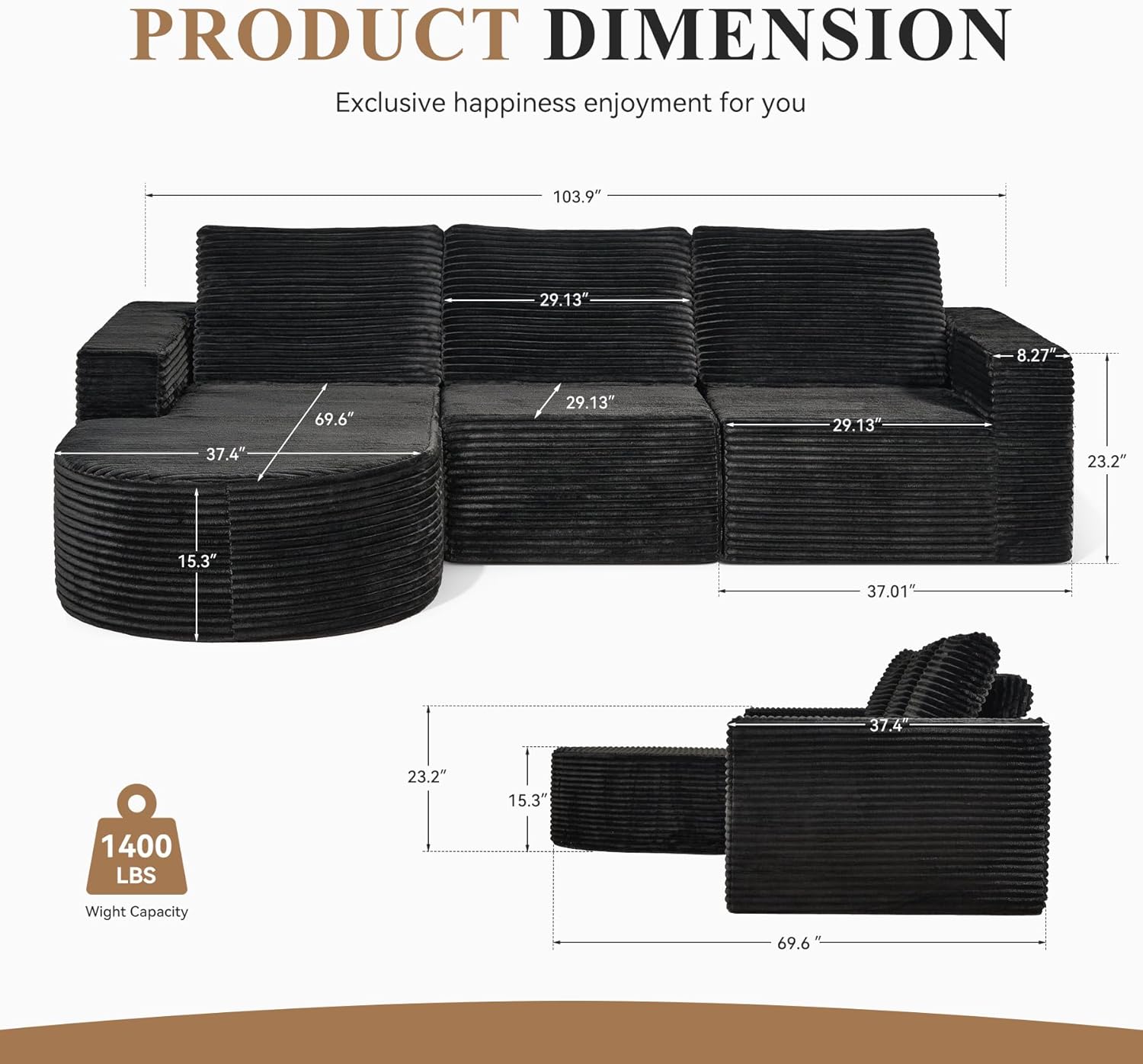 Modular Sectional Sofa with L-Shape Chaise,Cloud Sectional Modern Sleeper Couch with Deep Seat,Sponge Compression Sofas No Assembly Required(Plush Corduroy Fabric) 1PCS