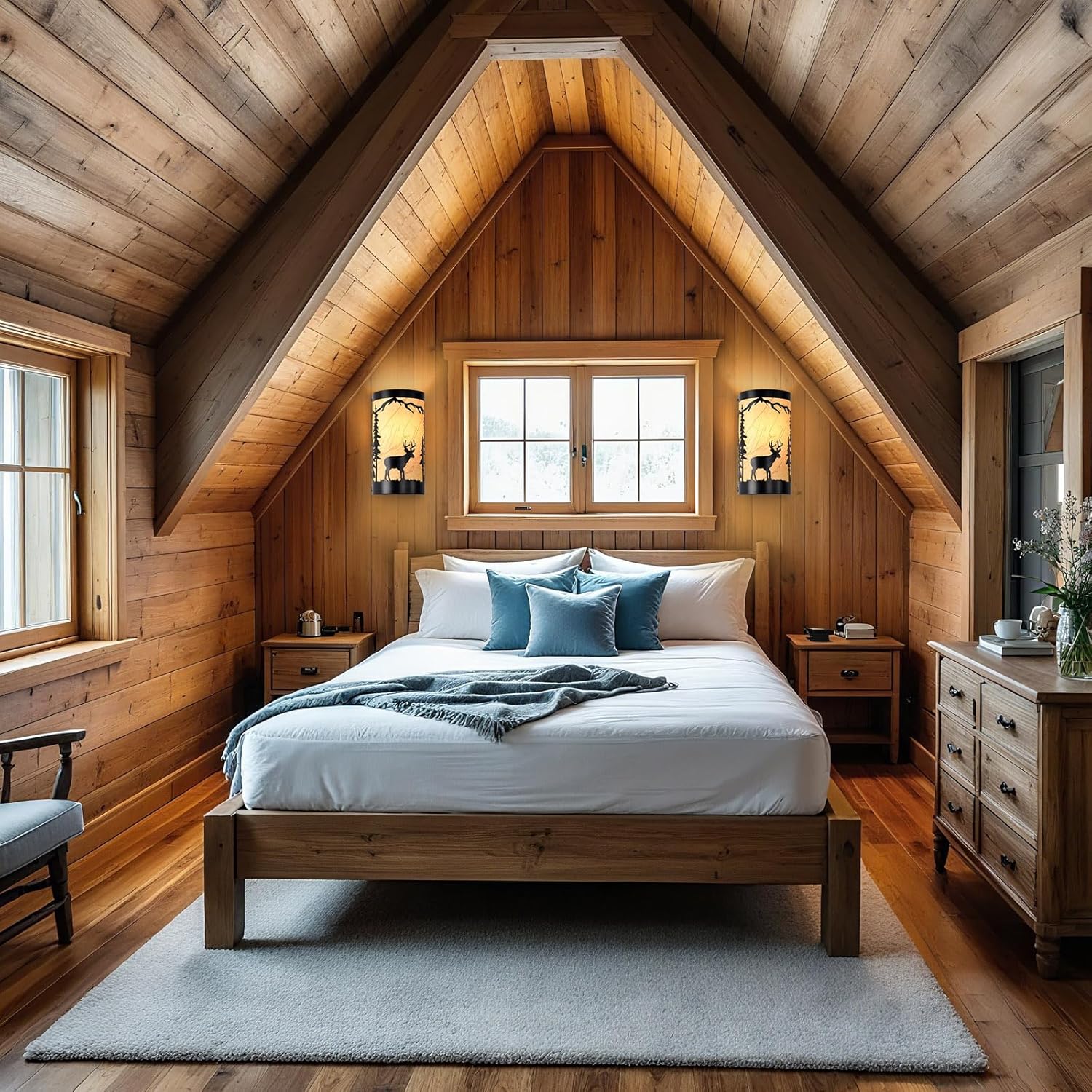 - Rustic Design: Farmhouse wall sconces set of two is crafted from durable matte black metal,featuring intricate forest elements and a deer silhouette,yellow parchment paper adds a soft,warm glow,enhancing industrial aesthetic of the black wall sconce