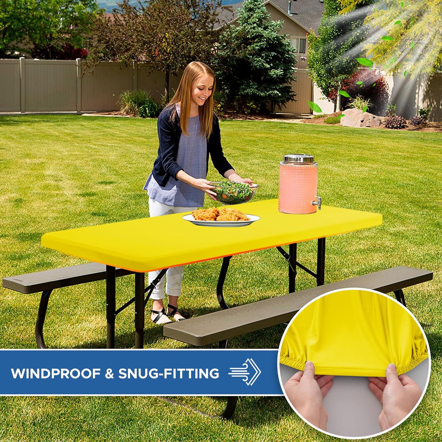 Fitted Tablecloth for 8 Foot Rectangle Tables-4 Pack Yellow Elastic Outdoor Picnic Table Cover-Spandex Stretch Folding Table Cloths 8ft for Camping Dining Room Patio Kitchen Banquet Party