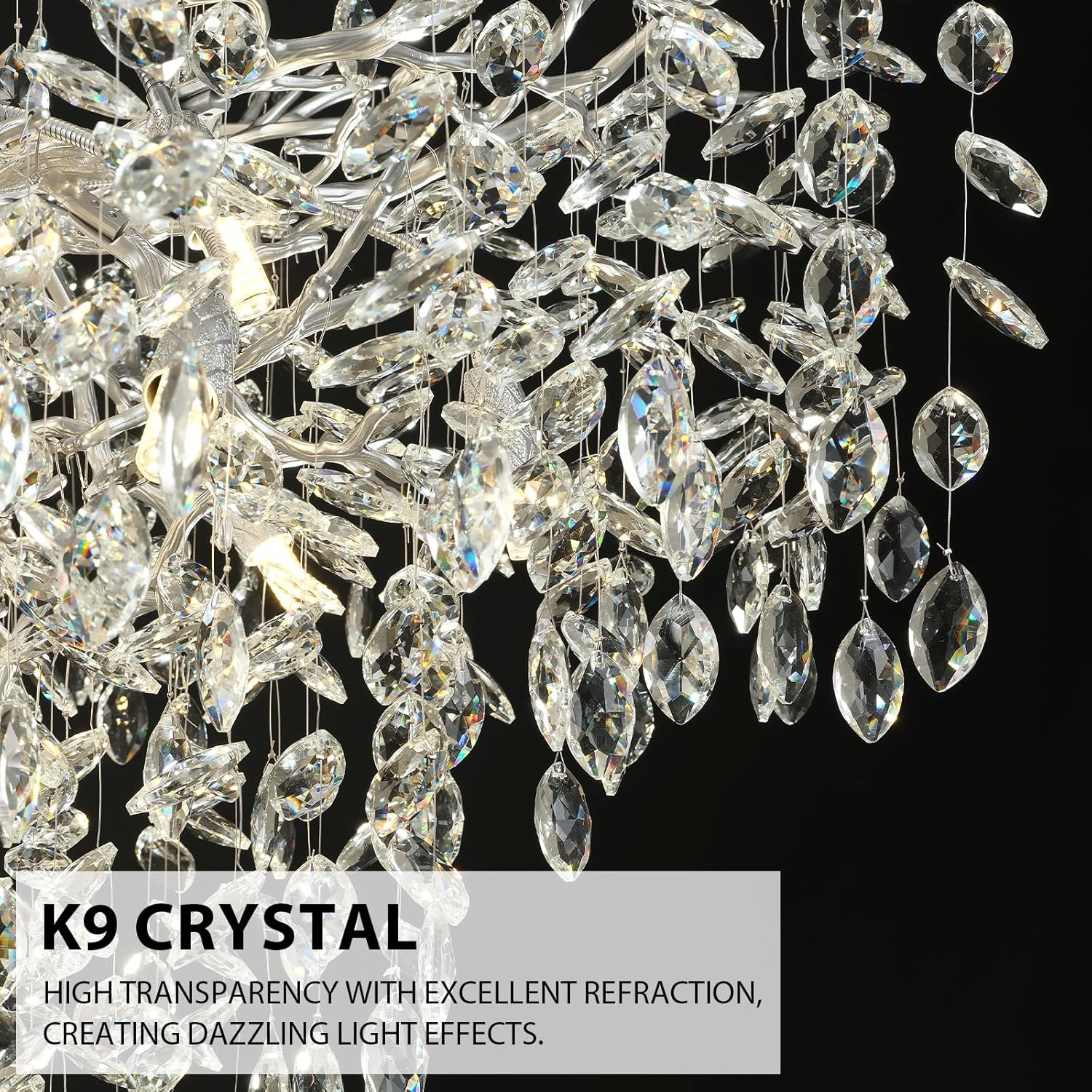- Classic Modern Design:Inspired by the graceful forms of nature, this high-ceiling chandelier features a flowing silhouette reminiscent of lush tree branches. Its refined design, paired with premium K9 crystal and a sleek silver finish, creates a striking focal point that blends timeless elegance with contemporary style—perfect for staircases, high ceilings, and sophisticated interior spaces.
