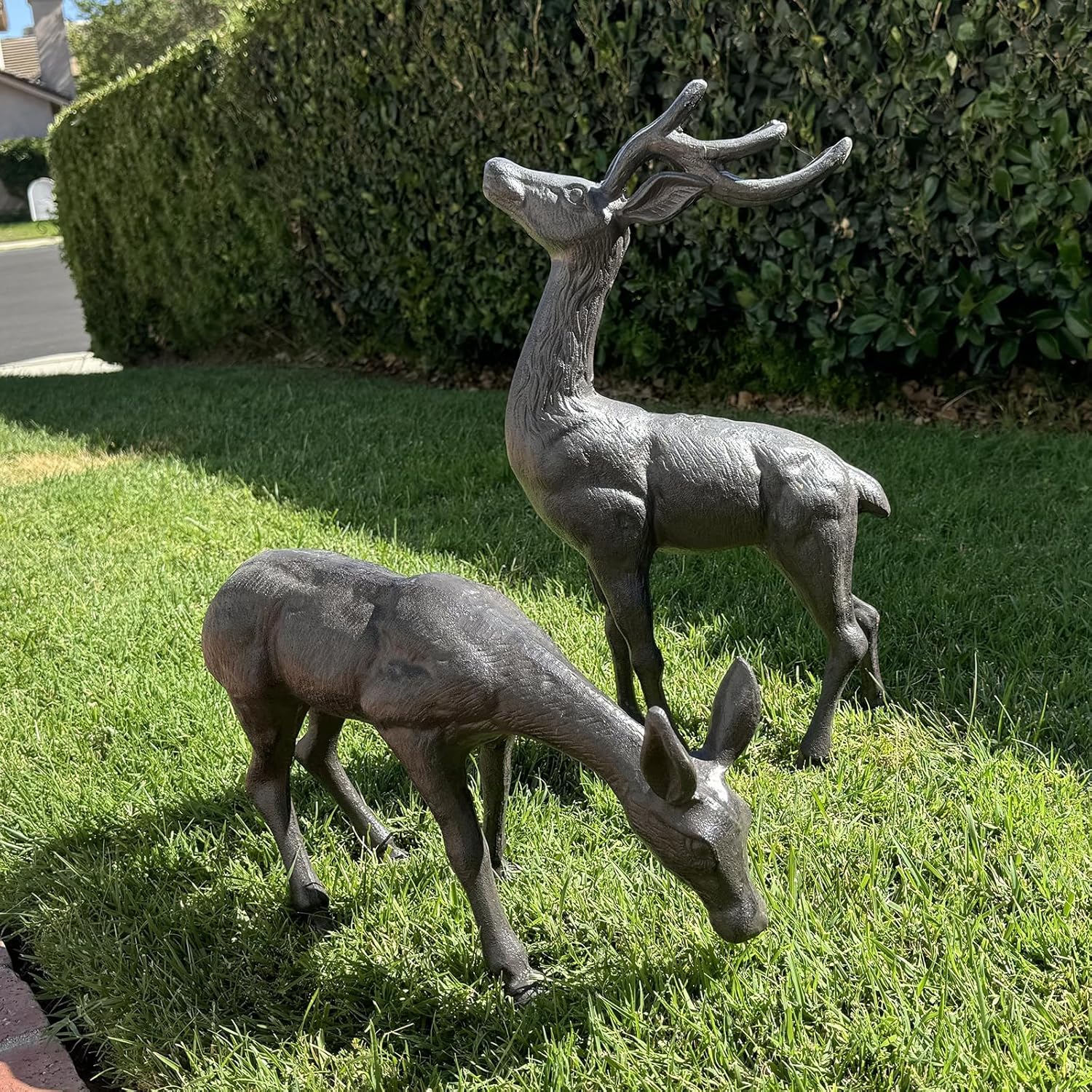 Elegant Pair of Cast Iron Deer Sculptures -22" and 11.4" Tall Male and Female Set for Outdoor Garden Decor, Realistic Animal Statues HC3672-5691