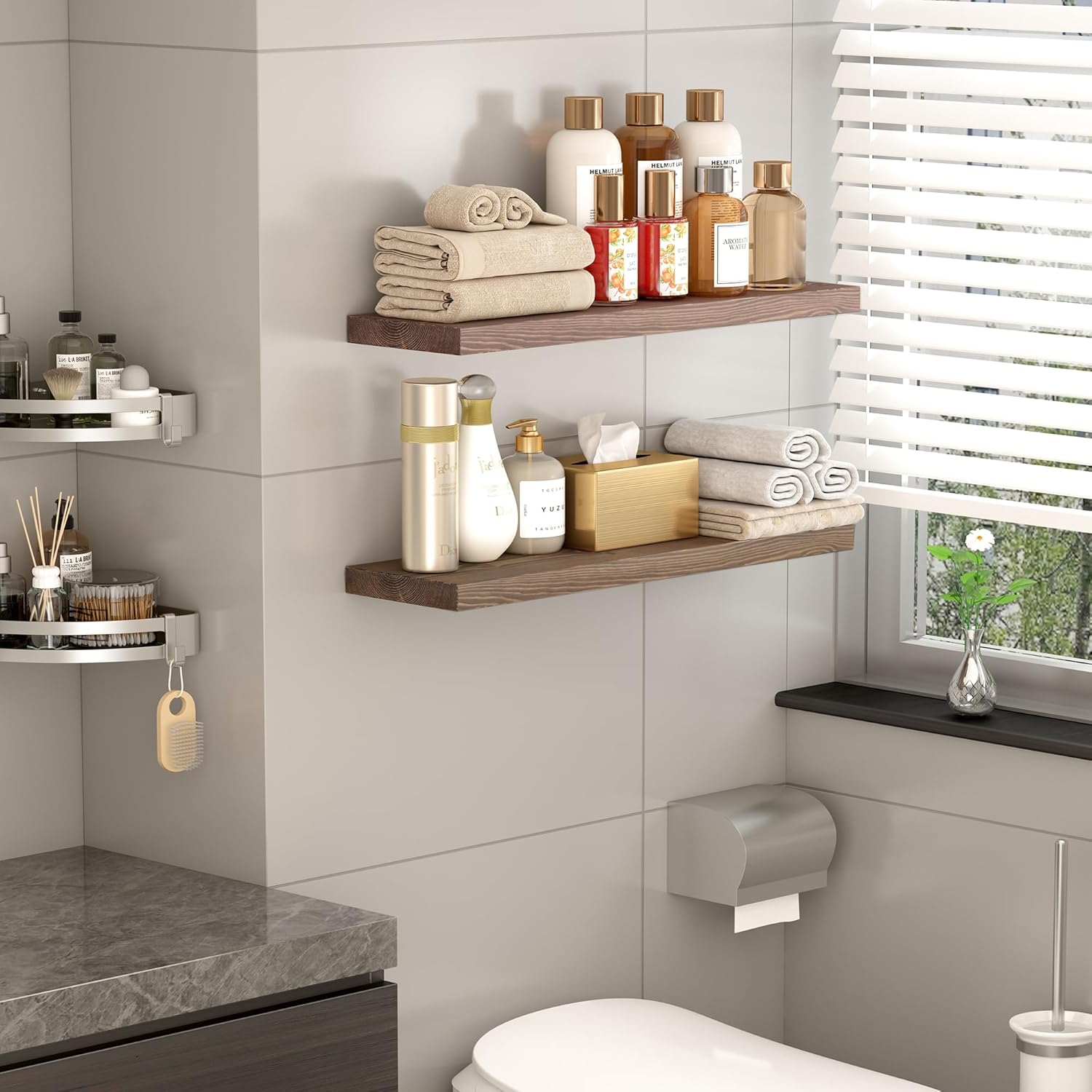 - Solid Wooden Floating Shelves:Crafted by hand from real pine, each 30 inch floating shelf shows off unique wood knots and is stained to create a warm, rustic look that feels right at home